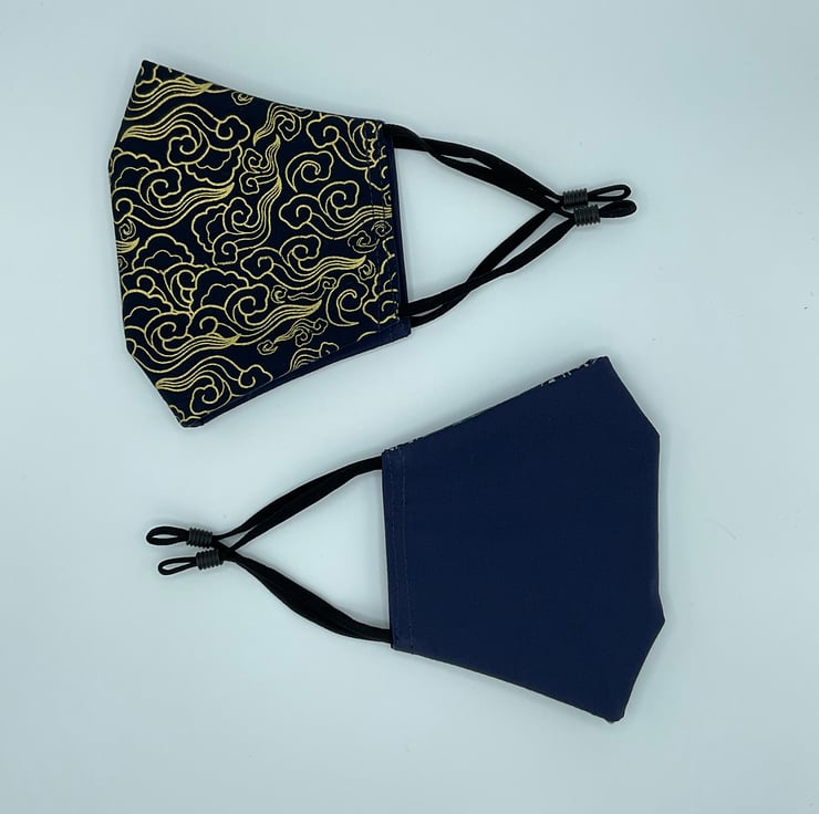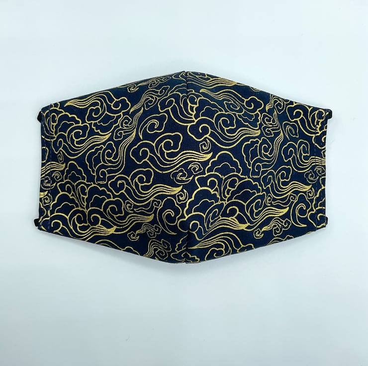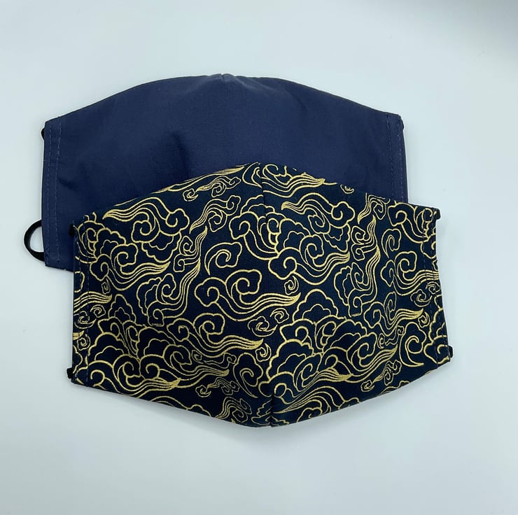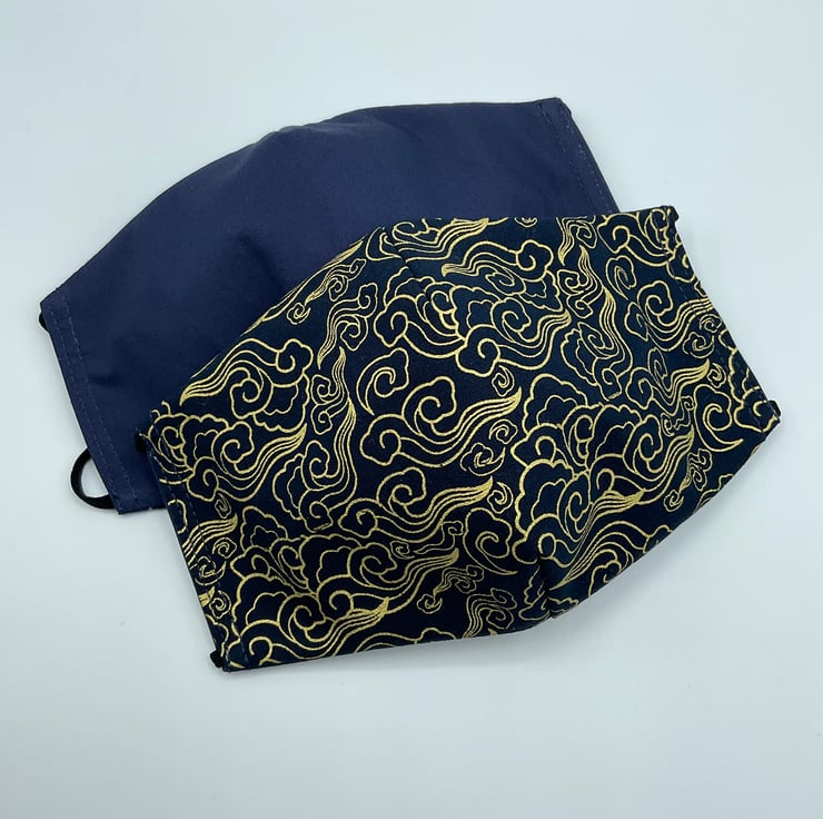 This is a double sided face mask, made from a dark navy blue Japanese style fabric with golden waves on one side and plain Navy Blue fabric on the other.
