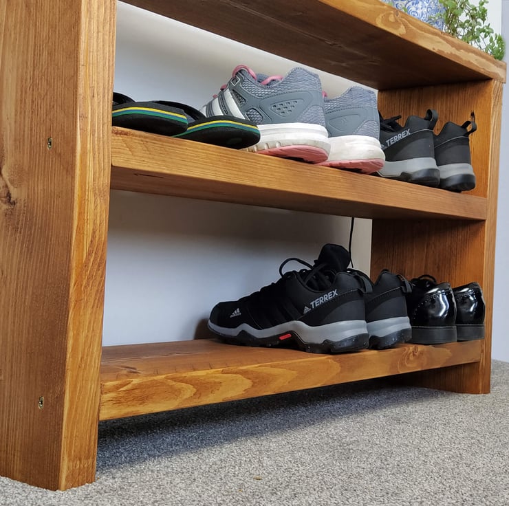 Our shoe rack / bench is perfect for your entrance, hallway or even tucked under the stairs!