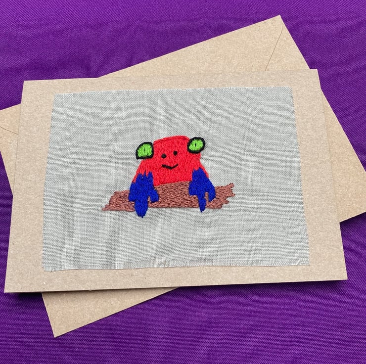 A cheery, bright hand embroidered tropical frog in lovely bright colours. The frog has been hand embroidered onto natural linen and mounted on a brown greetings card (10.5cm x 15cm/4" x 6"). The inside has been left blank for your own message.