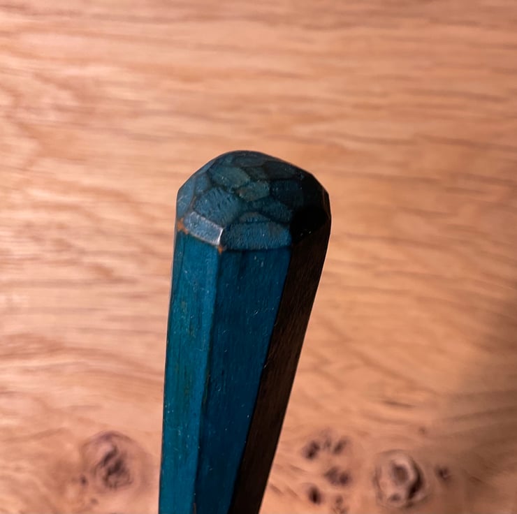 Hand made using traditional tools including axe, knife and drawknife. This spreader has been split from a fresh cherry log, the shape drawn on, before being axed out and then finish carved by knife. Thus, the finished item shows the lovely smooth facets from these sharp tools and no sanding is used. The stunning handle colour is applied using food safe milk paint, and then the wood grain and milk paint is enhanced and sealed using organic food grade linseed oil. My elf hat makers logo is also burned into the handle. The log used for making the spreader, was locally sourced from an arborist.