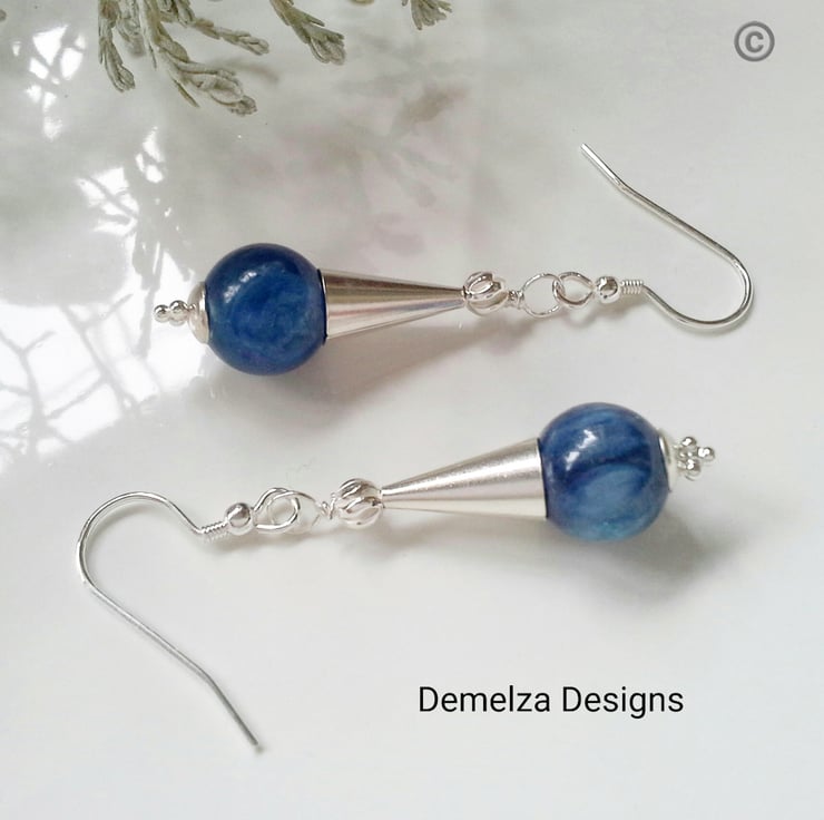 This is what kyanite is supposed to look like! Poor quality kyanite is light blue/gray. Quality like everything in life comes at a price, including the Himalayon kyanite strand of beads I purchased within the trade to make these earrings. The kyanite is completely natural with no enhancements applied to improve their appearance. I sold one other pair to a Folksy.com customer in Northern Ireland.