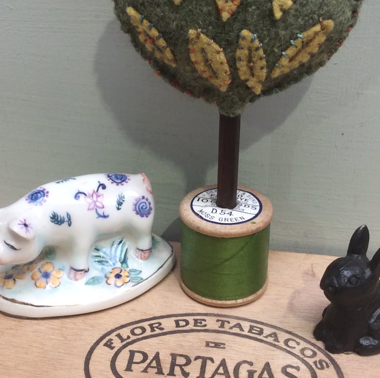 A cute little hand made tree, standing proudly on a vintage cotton reel.