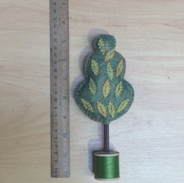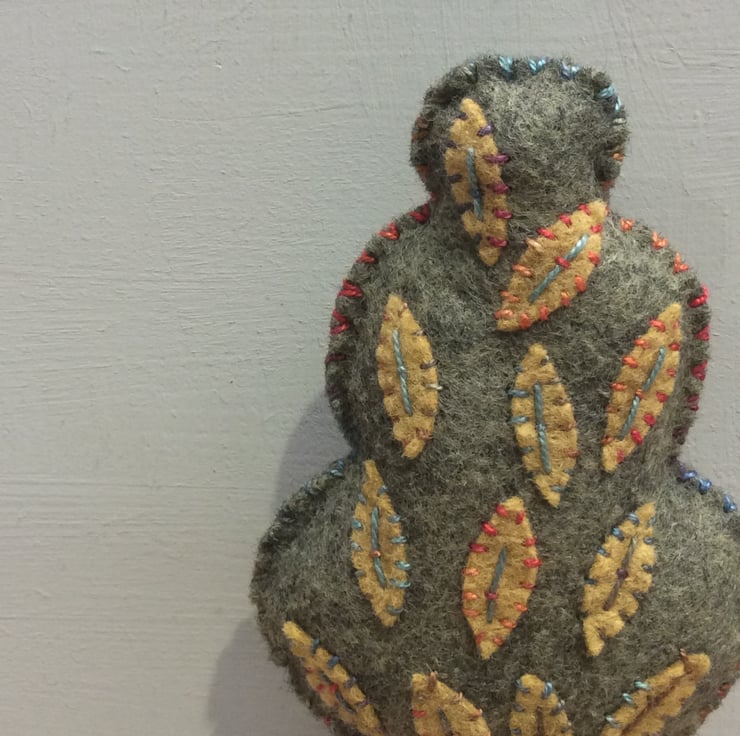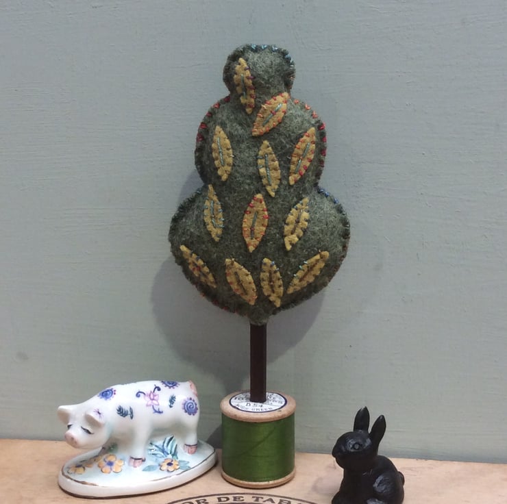 My own design, everyone is different and quirky. Hand stitched felt appliqué leaves with wonderful variegated pearle thread.