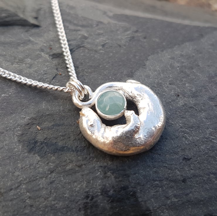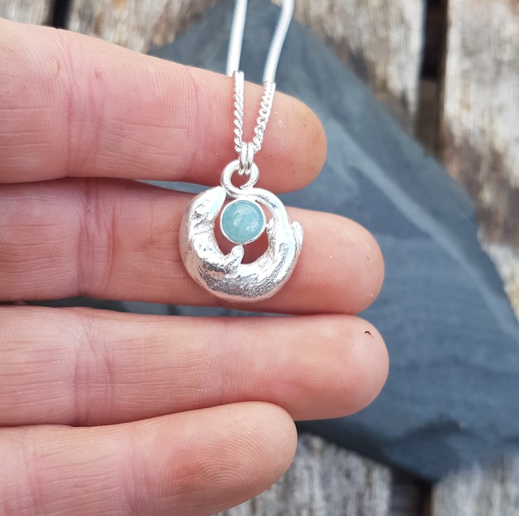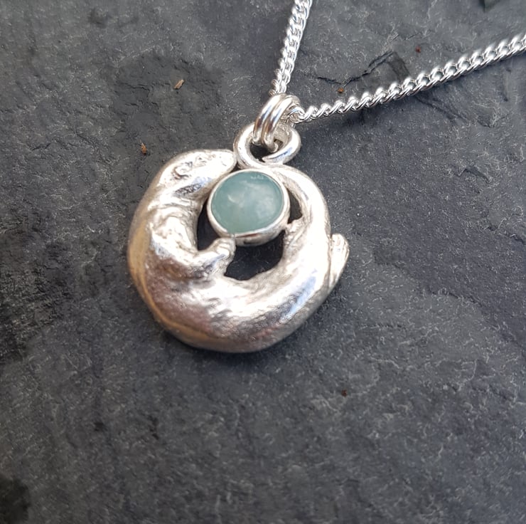 This beautiful necklace is of a sterling silver Otter, swimming round a stunning Aquamarine held in fine silver.
