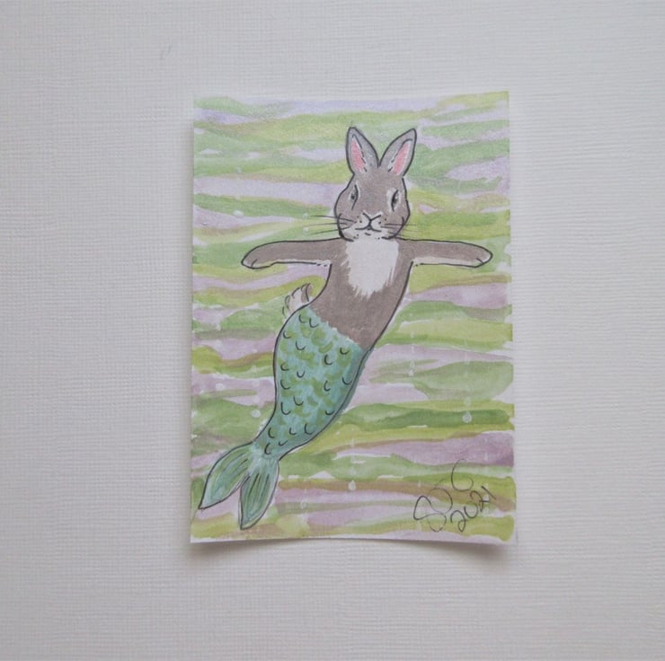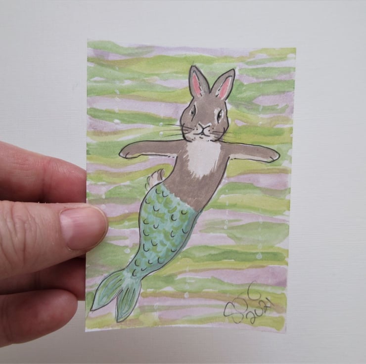 Merbunny ACEO Miniature Painting Watercolour Mermaid and Bunny Underwater
