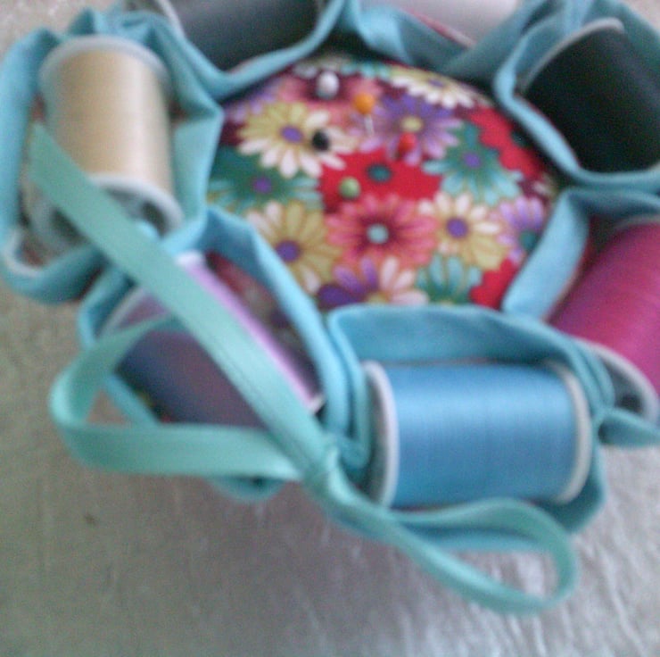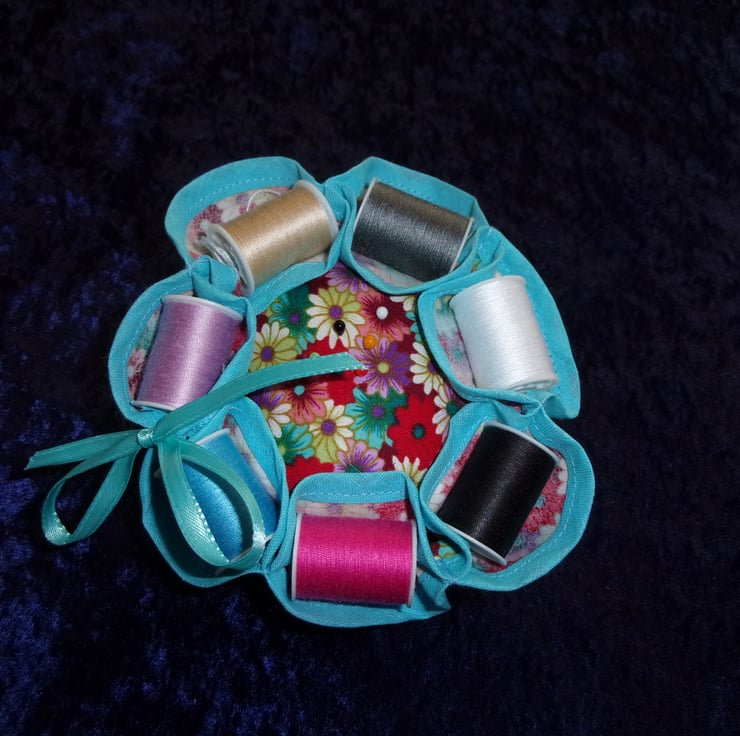 Made using two circles of cotton fabric, then edged with contrasting bias binding, it is stuffed using soft toy stuffing before the cotton reels are threaded onto ribbon and tied in a bow to stop them falling off, then this cotton reel pin cushion is an ideal addition to your sewing kit.