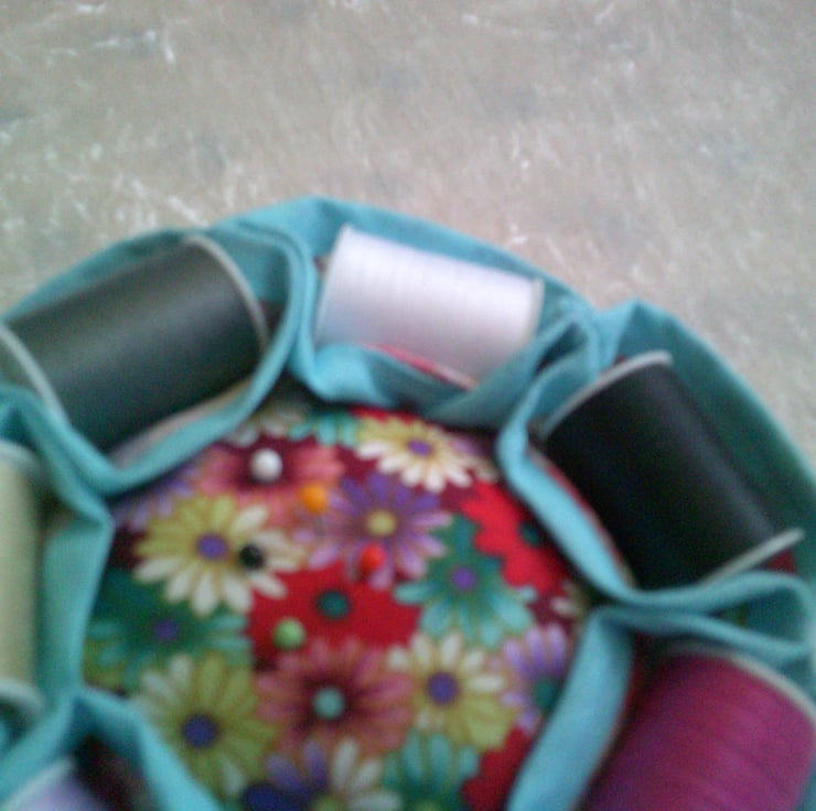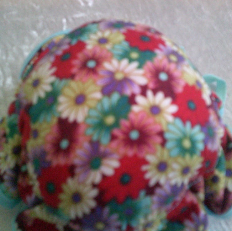 The design on this pin cushion is Green, blue, White and mauve flowers on red background and edged with Turquoise Blue Bias Binding.