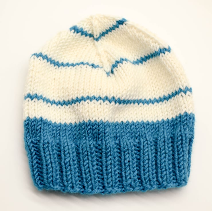 Hand knitted with unbelievably squishy Baby Cashmerino yarn which is ideal for precious new born skin. This beanie shaped hat is in a lovely jewel-like turquoise and white stripes.