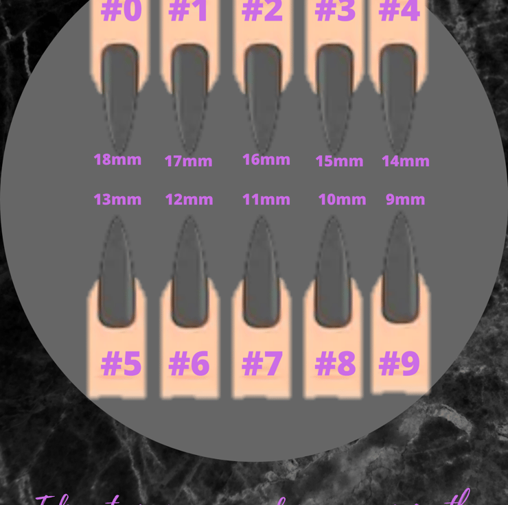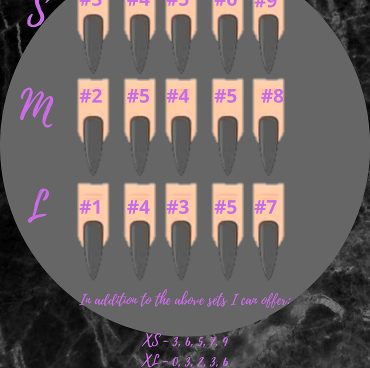 Can be ordered in set sizes or custom sizes (Please see information in the pictures for sizing your own nails).
