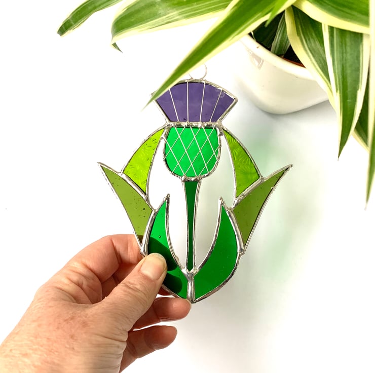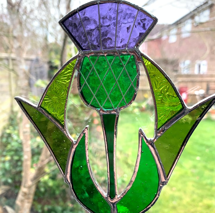 This has been made from 5 types of green stained glass for the leaves and stem and purple corella glass for the flower head. Tinned copper wire has been used to add detail to the flower.