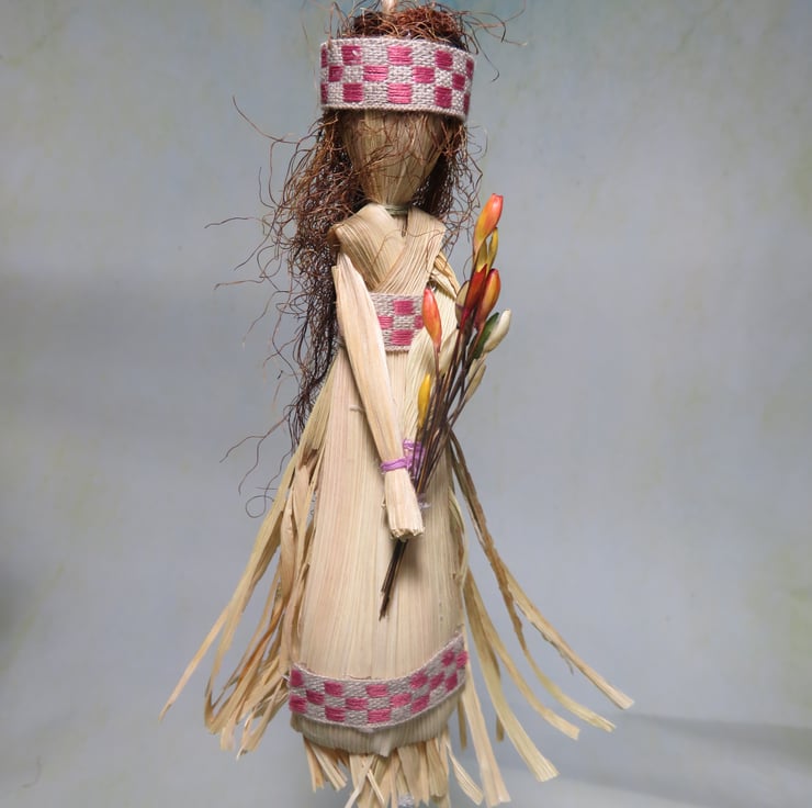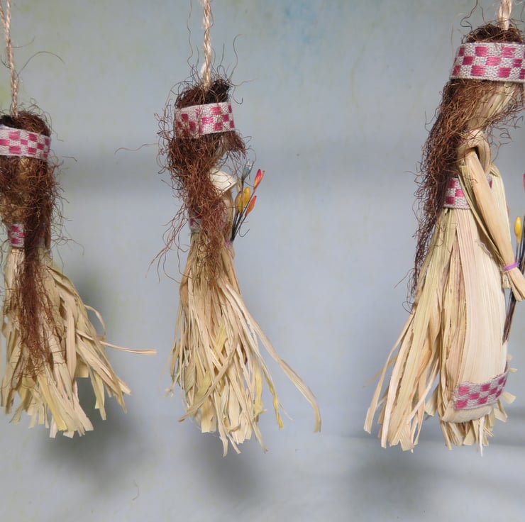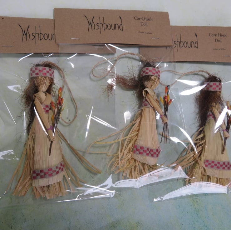 Corn Husk Indian style doll ornated with ribbon, corn silk hair and with a hemp loop for hanging. Each corn husk doll is appproximately 15 cms tall and is carrying dyed wheat flowers. Corn Husk dolls can last a very long time as long as they are not kept in humid conditions.