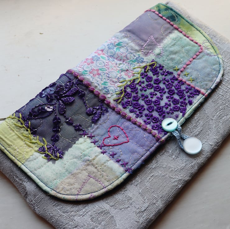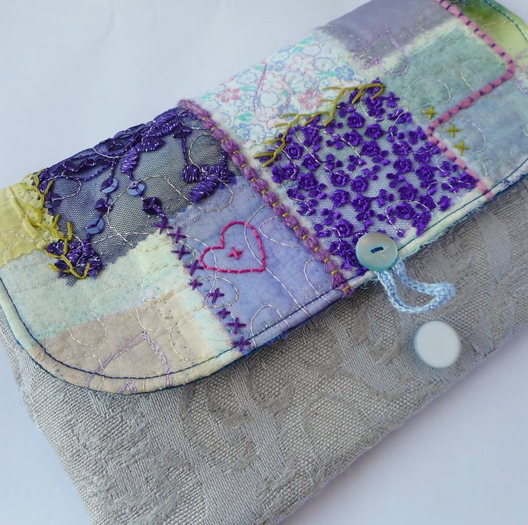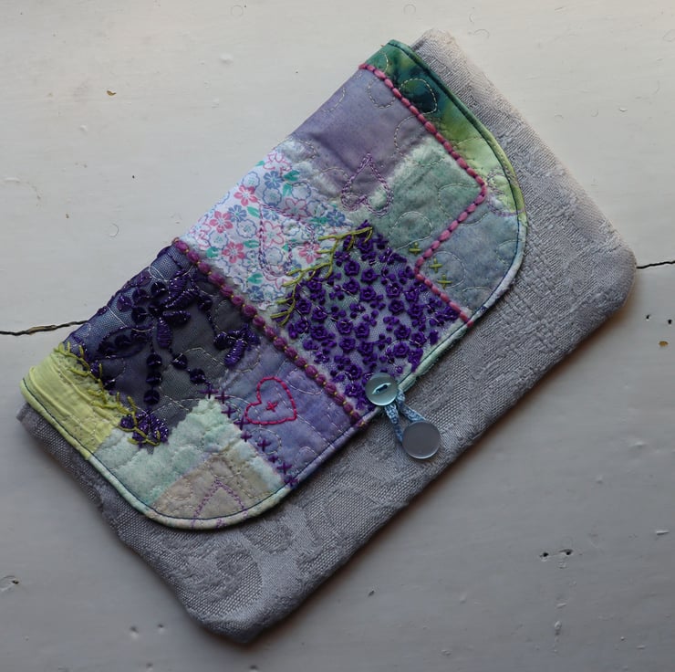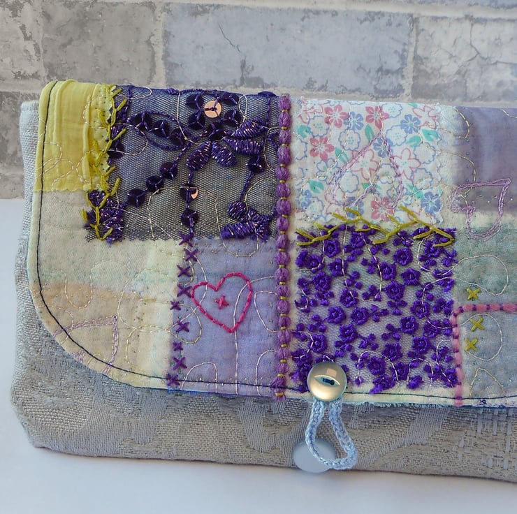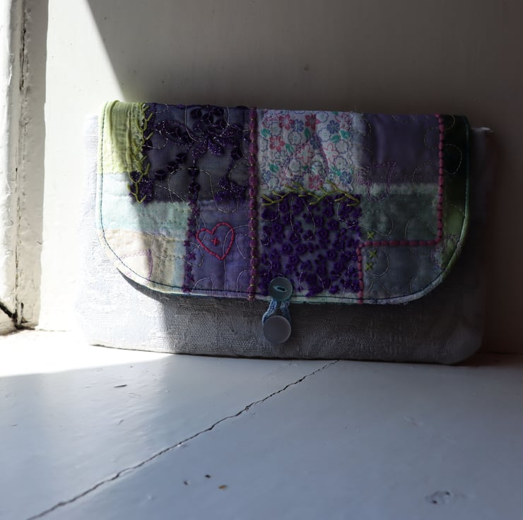 Handmade, embroidered clutch bag in silver, purple and mint green