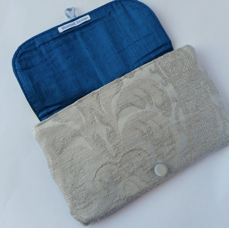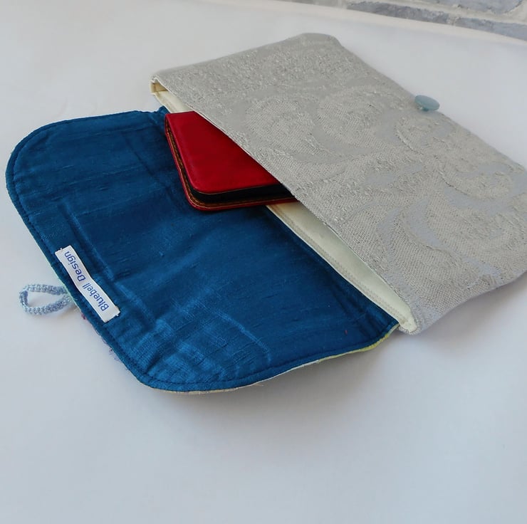 Fabric clutch bag with pieced textile art flap with hand and machine embroidery. The bag flap is lined with a teal silk dupion, whilst the rest of the bag is lined simply in ivory cotton.