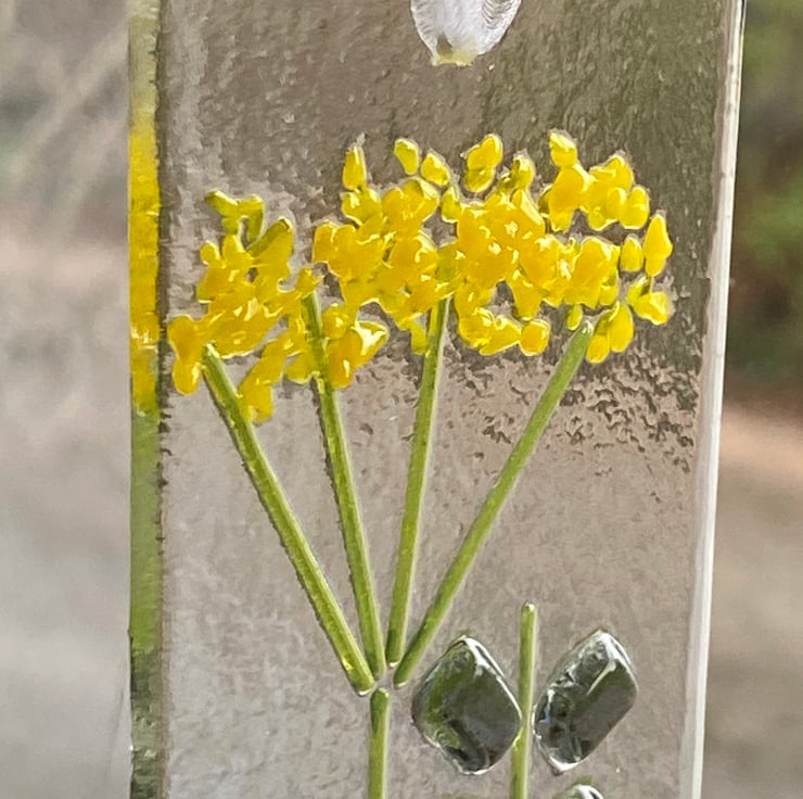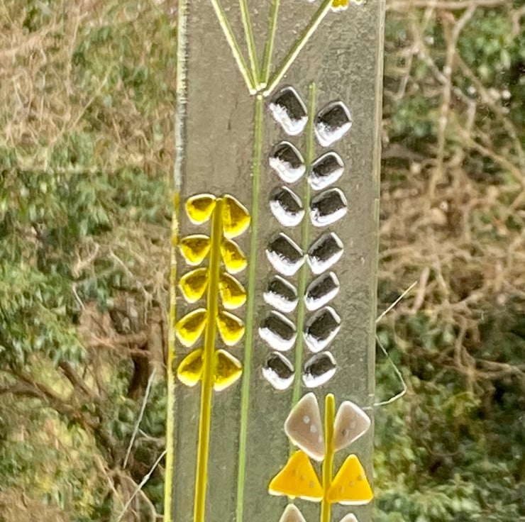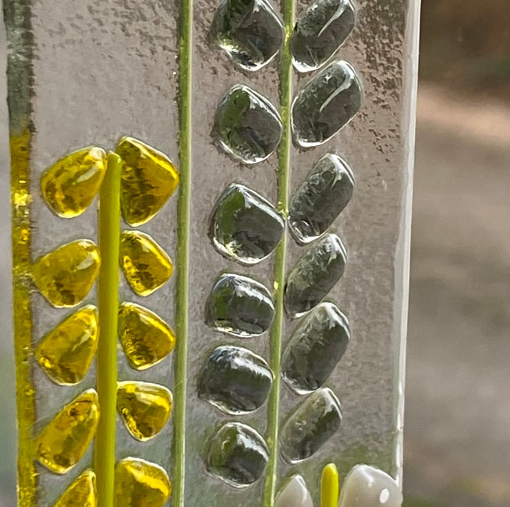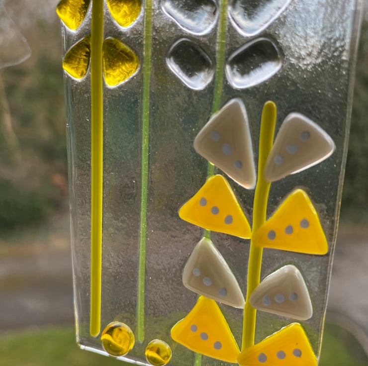 Yellow and grey feature in this retro style light catcher. Tall stems and petals fill the long glass panel which measures 17cm by 5cm.