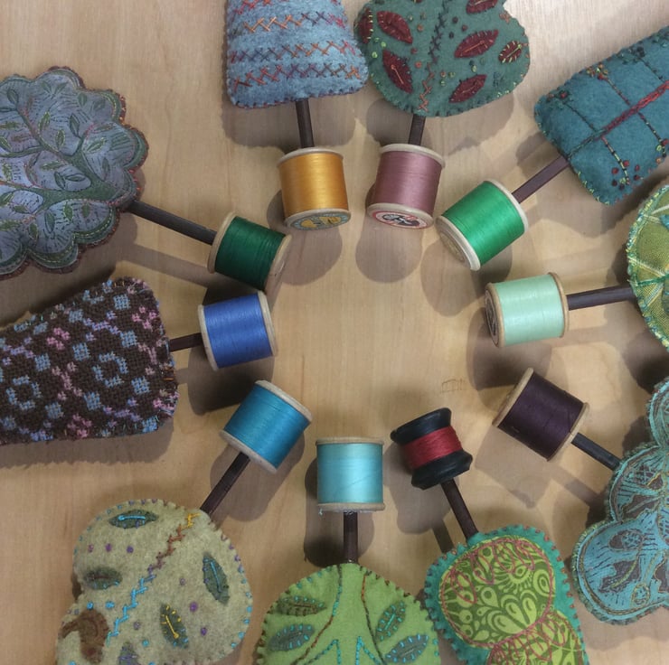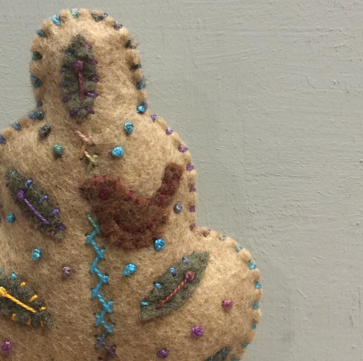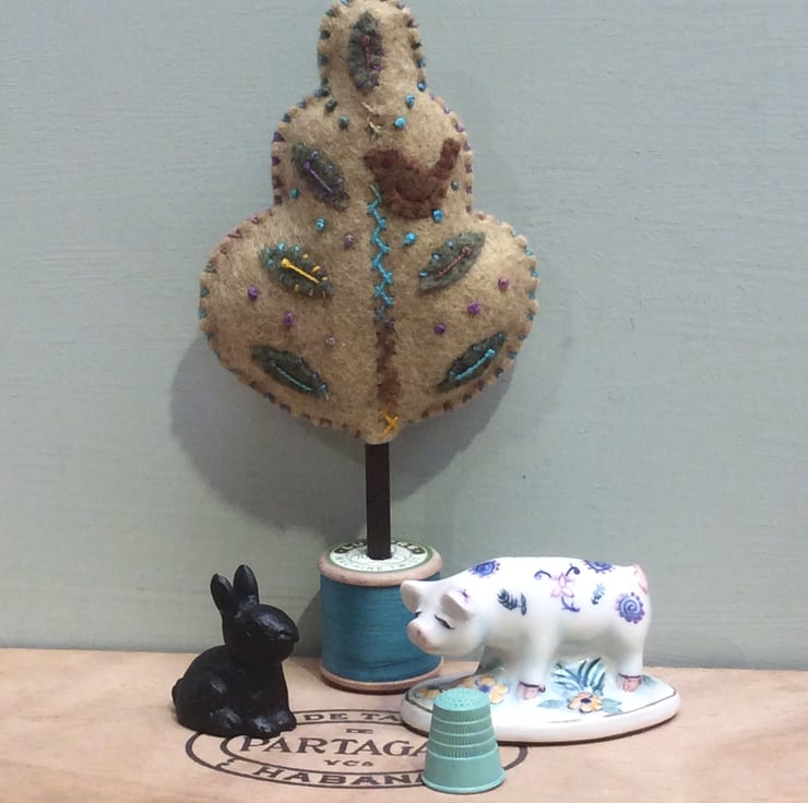 My own design, everyone is different and quirky. Hand embroidered with felt appliqué, I use wonderful variegated pearle thread, it’s very addictive.