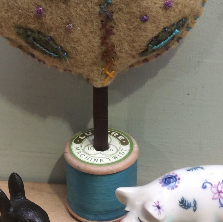A cute little hand made tree, standing proudly on a vintage cotton reel.