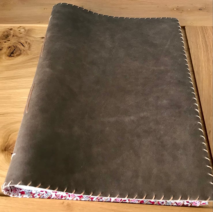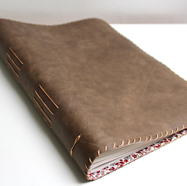 A lovely smooth brown leather with a pretty red and grey floral fabric lining. The notebook is hand stitched around the edge with a tan coloured thread and contains 200 sheets of thick recycled paper which are then hand stitched to the leather in 5 signatures. This would make a lovely sketch book.