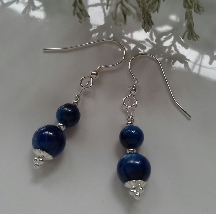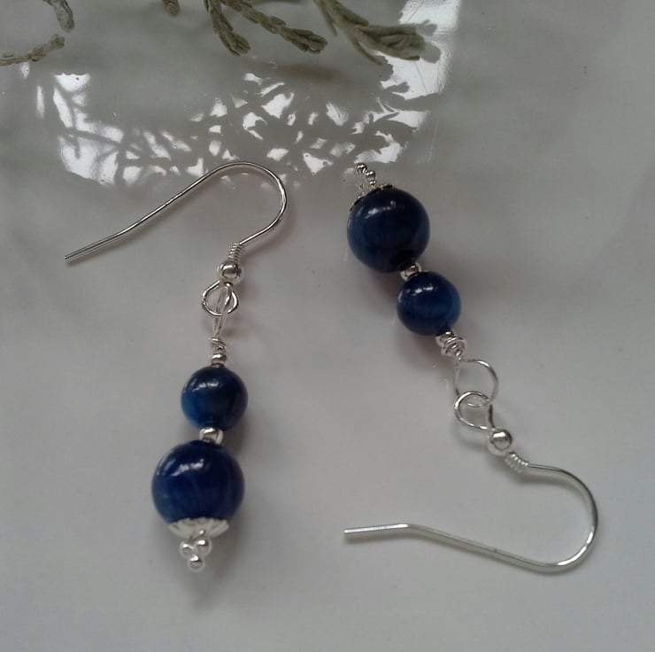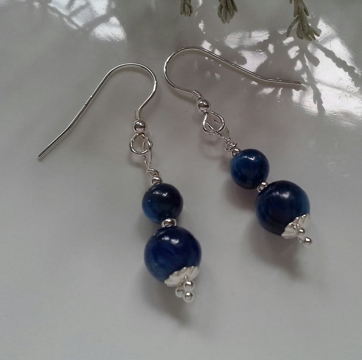 This is what kyanite is supposed to look like! Poor quality kyanite is light blue/gray. Quality like everything in life comes at a price, including the himalayon kyanite strand I purchased within the trade to make these earrings. The kyanite gemstone beads are completely natural with no enhancements applied to improve their appearance.