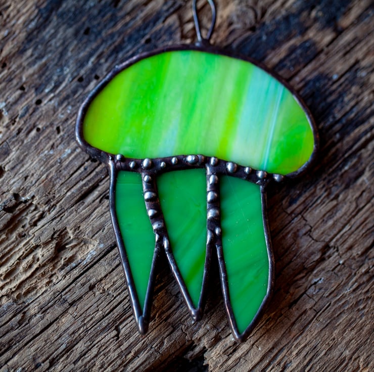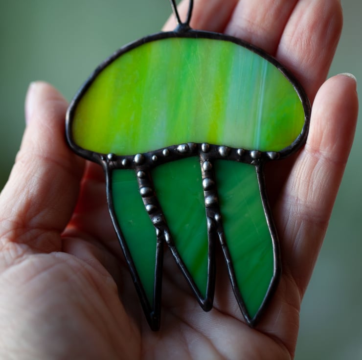 Here is for you colourful jellyfish. Made of real stained glass using Tiffany technique. This suncatcher would make a beautiful addition to any room and bring some whimsy. Definitely brights it up! The suncatcher is approximately 10cm long and 7cm wide.