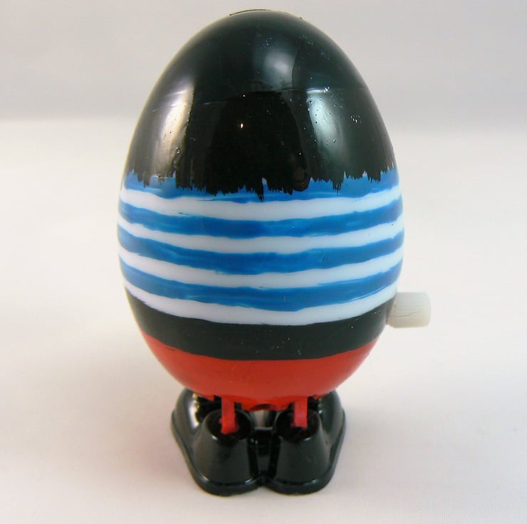 This little wind up plastic hopping egg doesn't hop far to be honest so more for decoration really and would look cute standing on a shelf. I have hand painted this egg as a pirate, with black boots and gold cutlass in his belt .