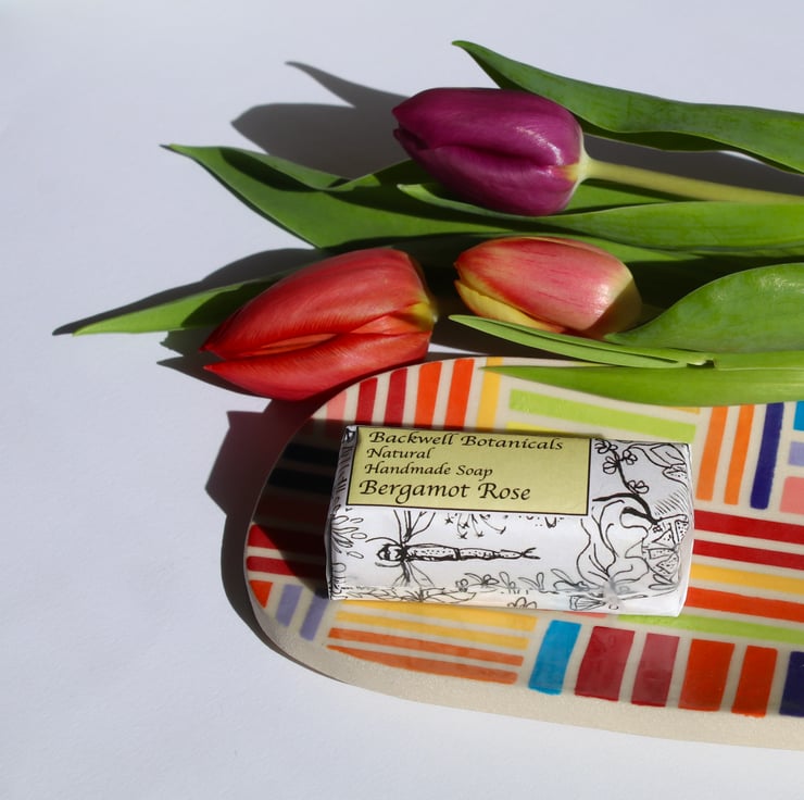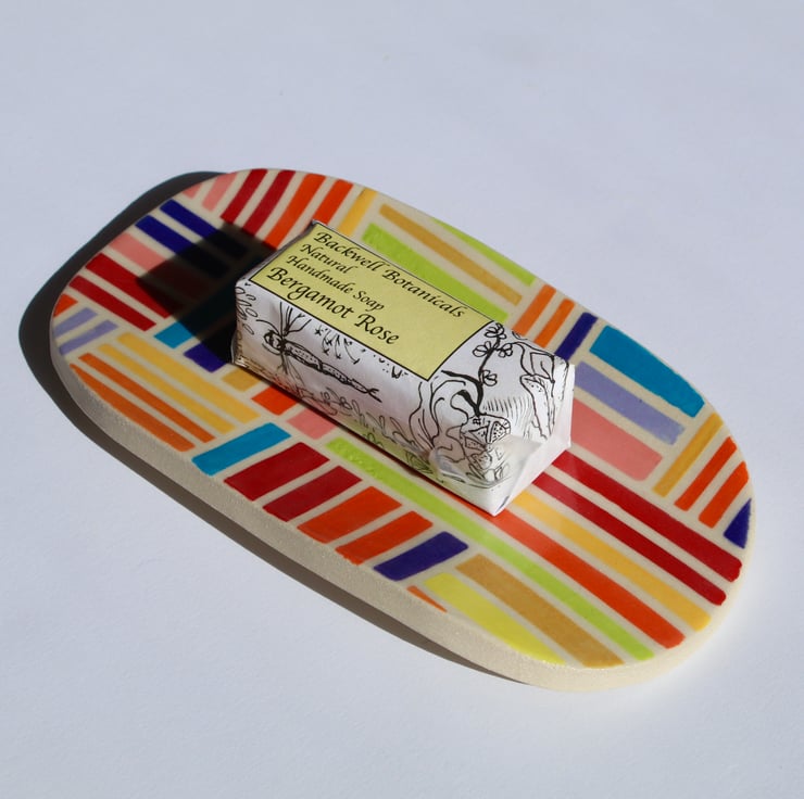 These dishes are really useful to use as soap dishes, spoon rests, nibbles trays or just to look at! The back of the dish is unglazed white clay with my maker’s mark. Each one is unique and sent out with a little bar of locally made organic soap in a straw-lined gift box.