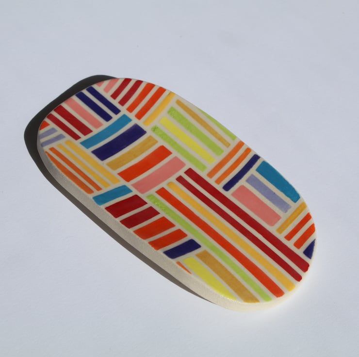 I made this ceramic dish from beautiful white clay. The dish is about 15cm long by 9cm wide and has been handpainted with colourful underglazes to represent a bird’s eye view of the Dutch bulb fields!