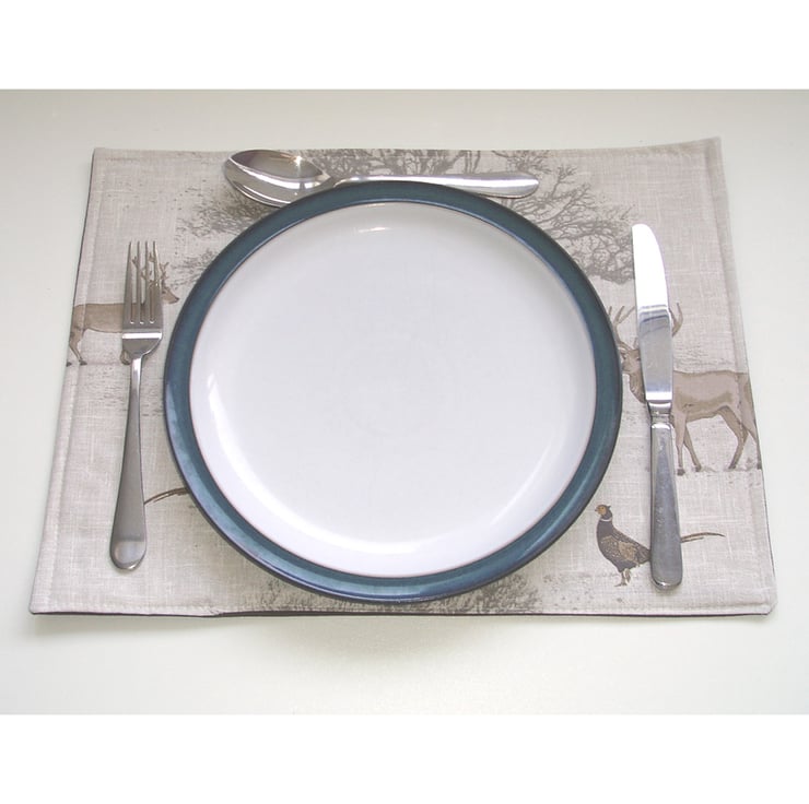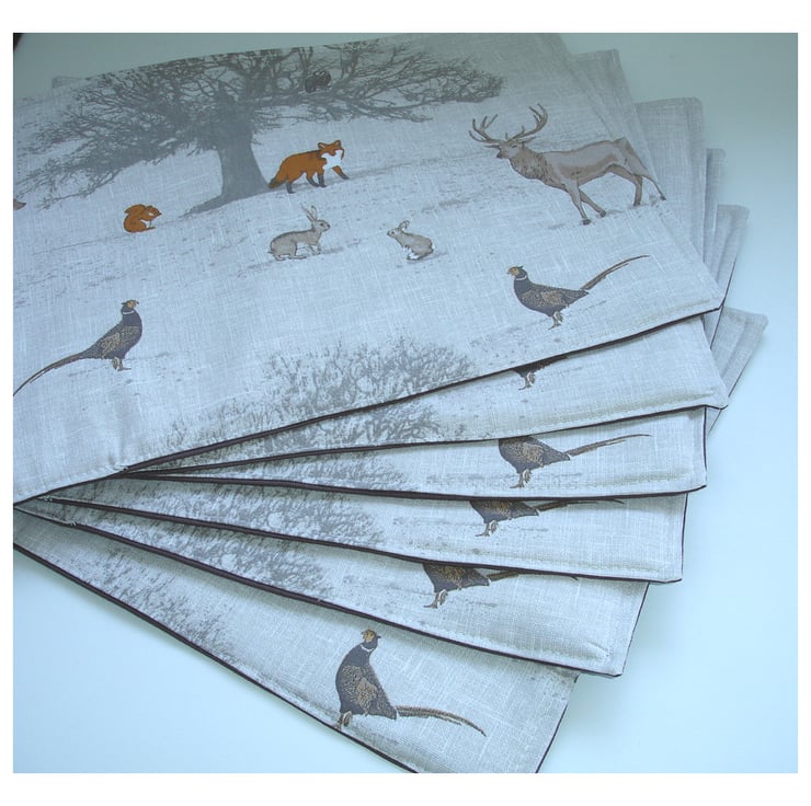Decorative Placemats - Woodland Scene featuring Stags, Fox, Squirrels, Rabbits, Pheasants, Owl. Backed with a plain dark brown fabric.