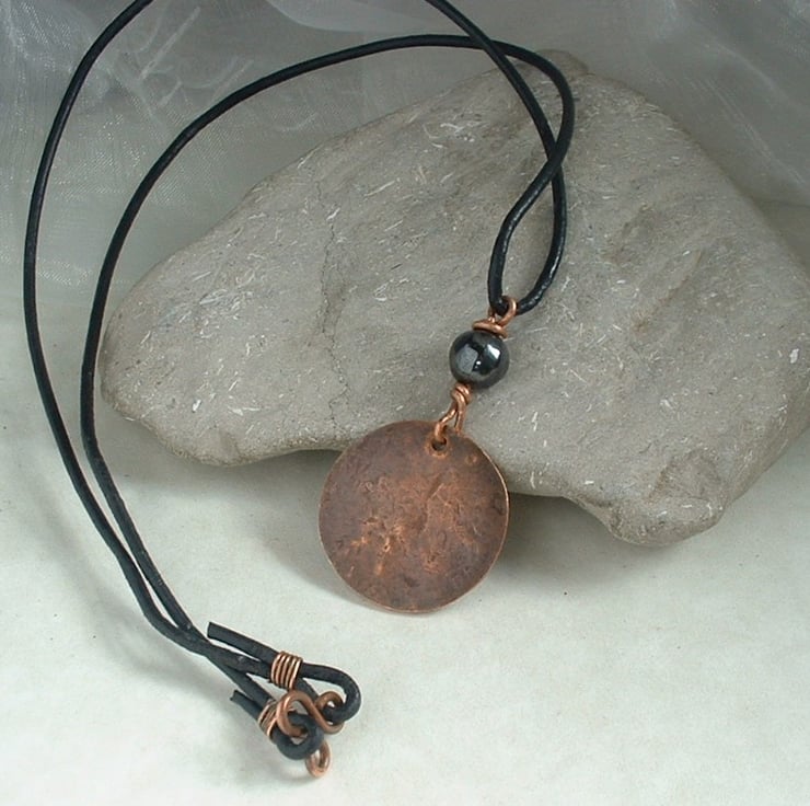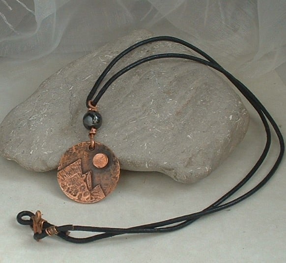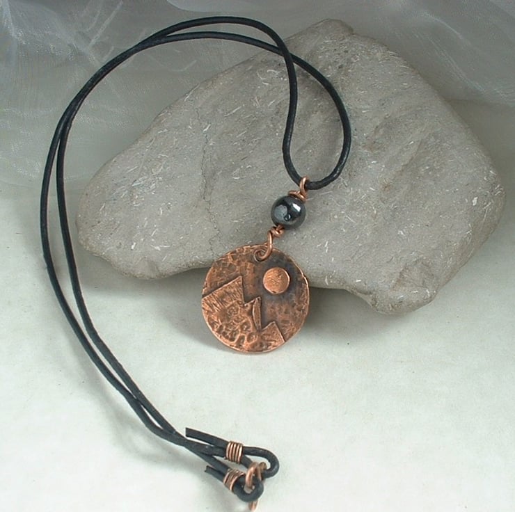 A beautiful moonlit mountain scene depicted in copper. Textured copper foil mountains soldered to a textured copper plate background with a small circle of copper for the moon. Oxidised to give an antique finish with polished highlights and sealed with a silicon wax polish. A black iridescent bead and a leather cord with a copper fastening completes the design.