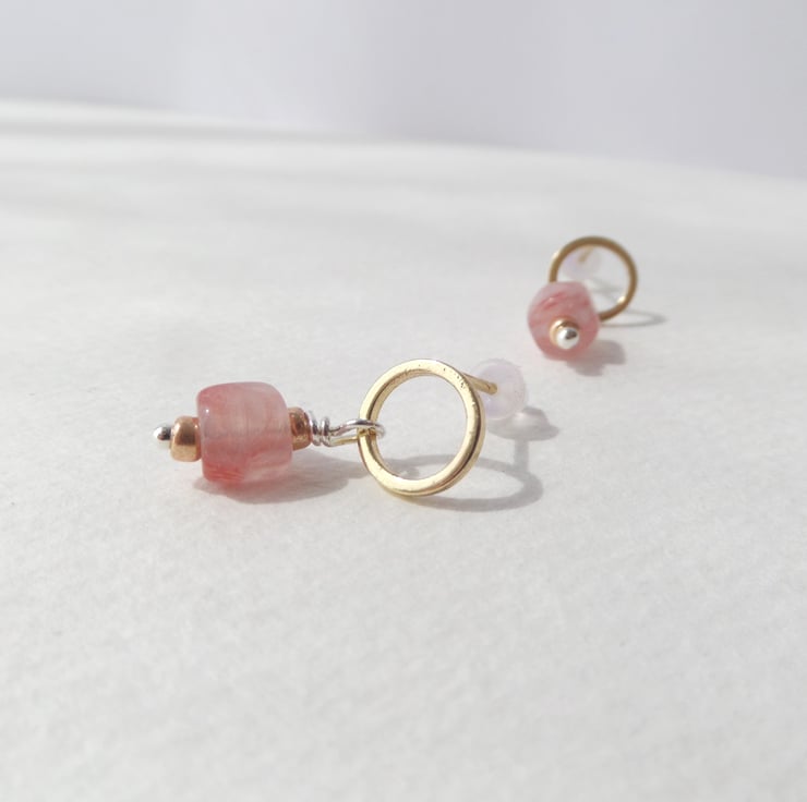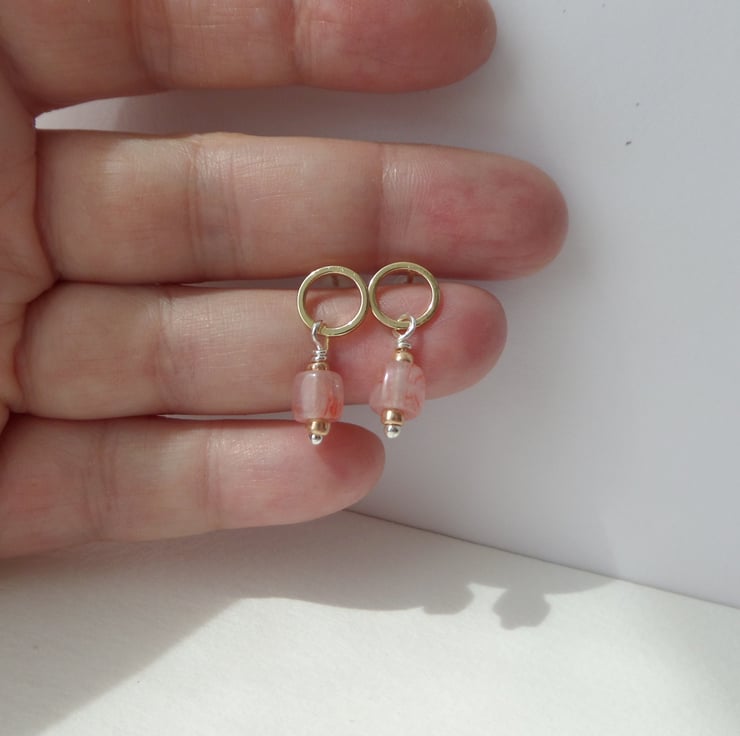 Modern and chic, these everyday gold open circle earrings have organic looking glass beads in peach.