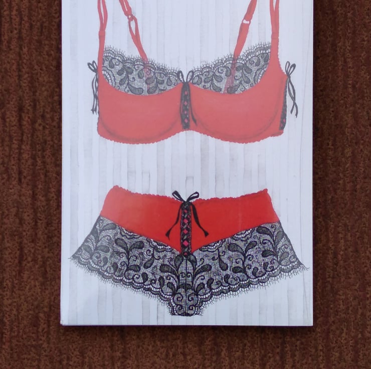 Notepad with a magnetic back. Red and black lace bra and knickers print on the front form my original watercolour painting. This was the first of many Lingerie paintings, they are listed in my 'Lingerie Collections' on my shop. The notepad measures 15mm x 10.5mm. It is a fun, flirty and useful thing to stick on your fridge. A great little gift for list makers and lingerie lovers. There is a matching ceramic mug so you can have a cuppa whilst making your list.