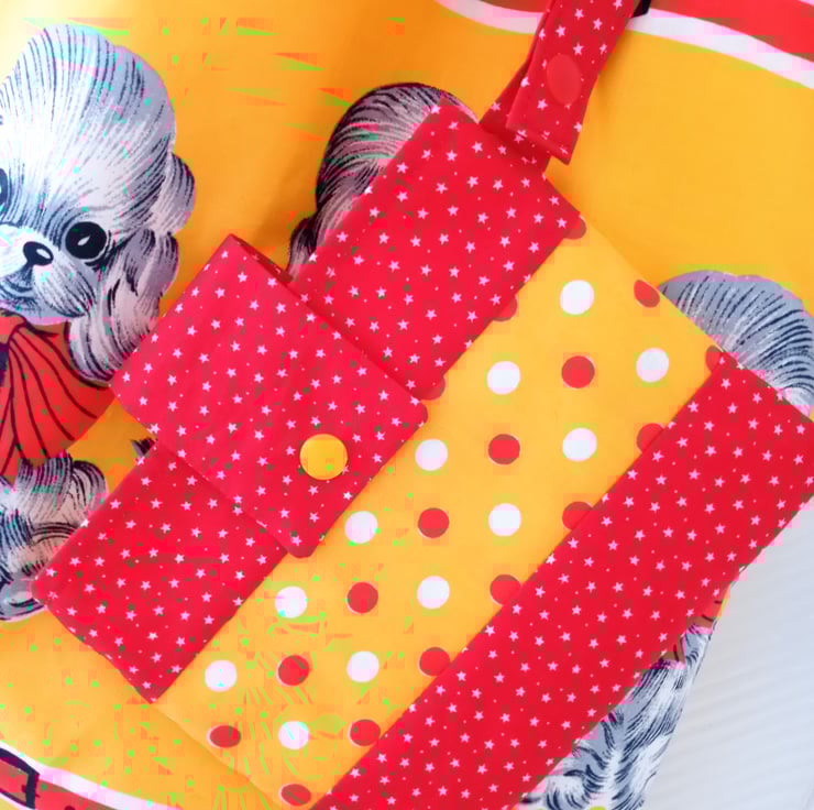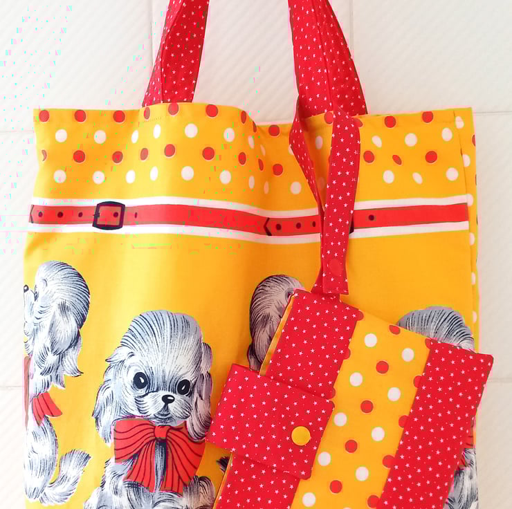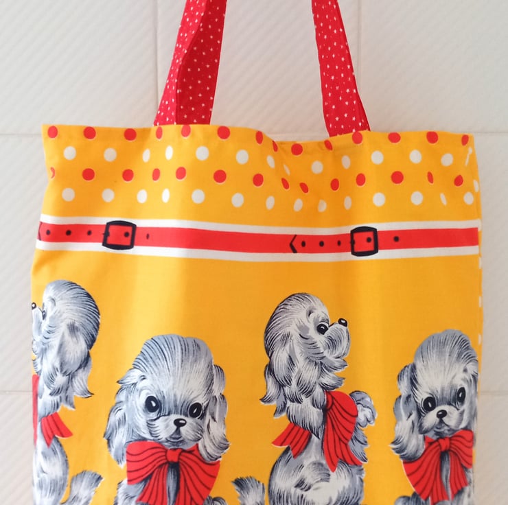 The puppies on the front can't wait to go shopping with you. The back is a little bit plainer but really cheerful.