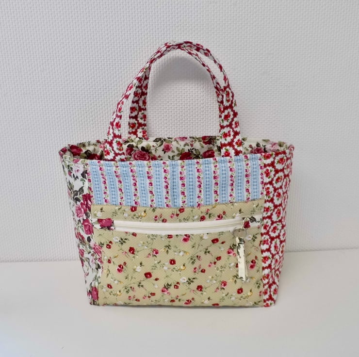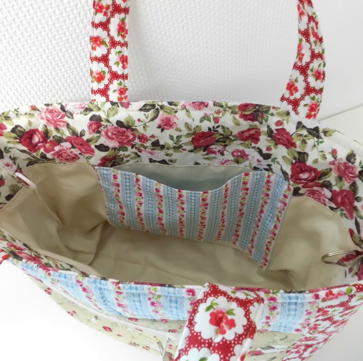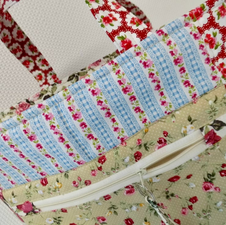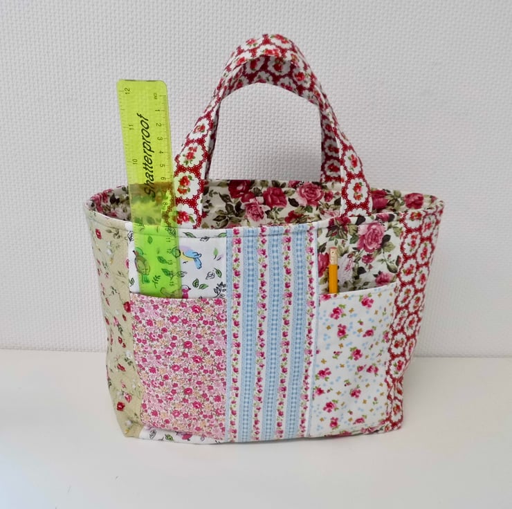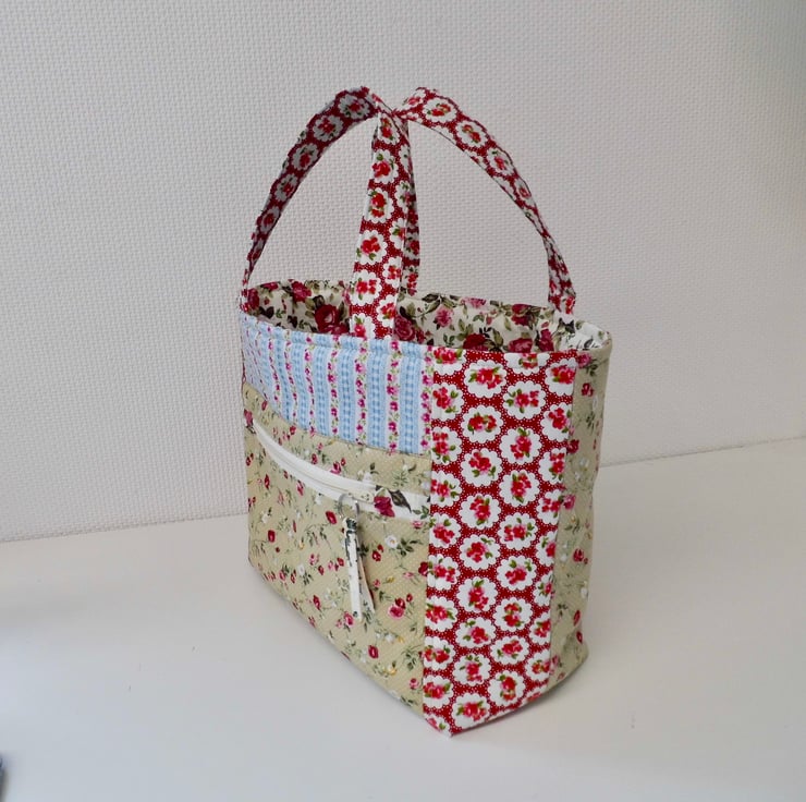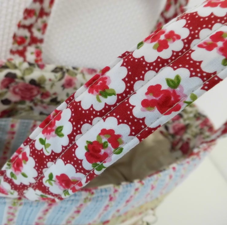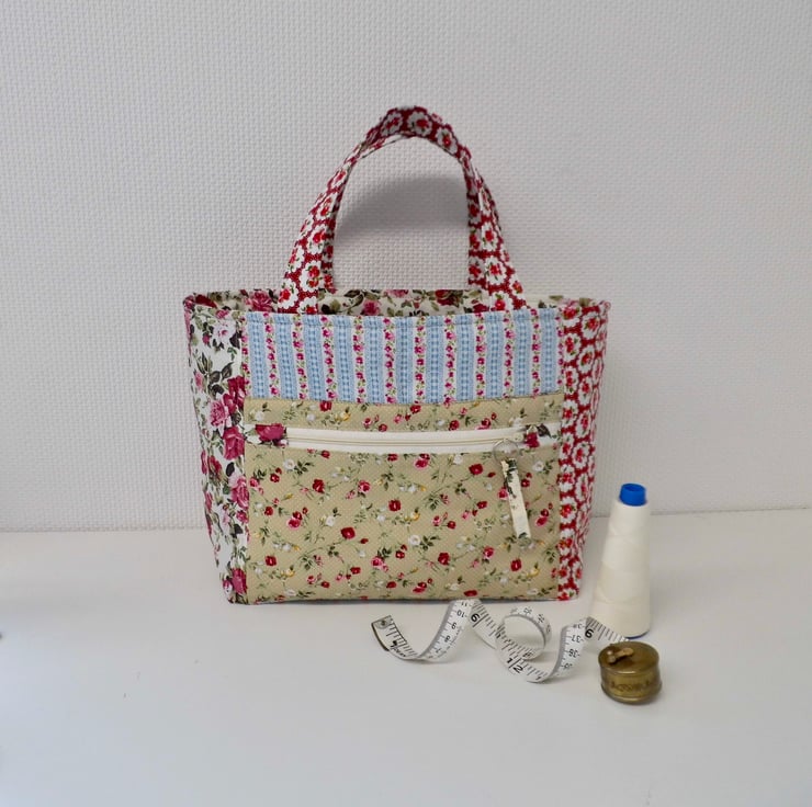 I chose lots of different cotton prints for this colourful short handled tote, which would make a great project bag. It is fully lined and interlined with polyester fleece to give it a slight padded effect and give it a good shape. Lots of top stitch detail. Faced at the top for a professional finished and then lined with a cream lining cotton. I have boxed the base to give the bag a flat bottom.