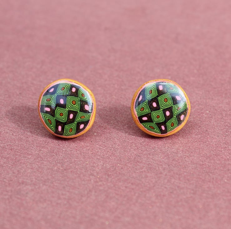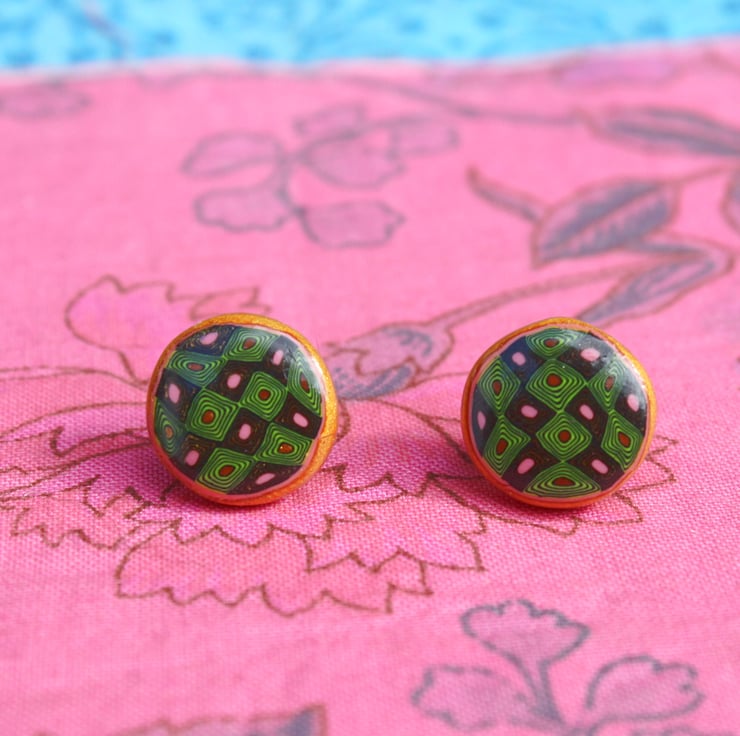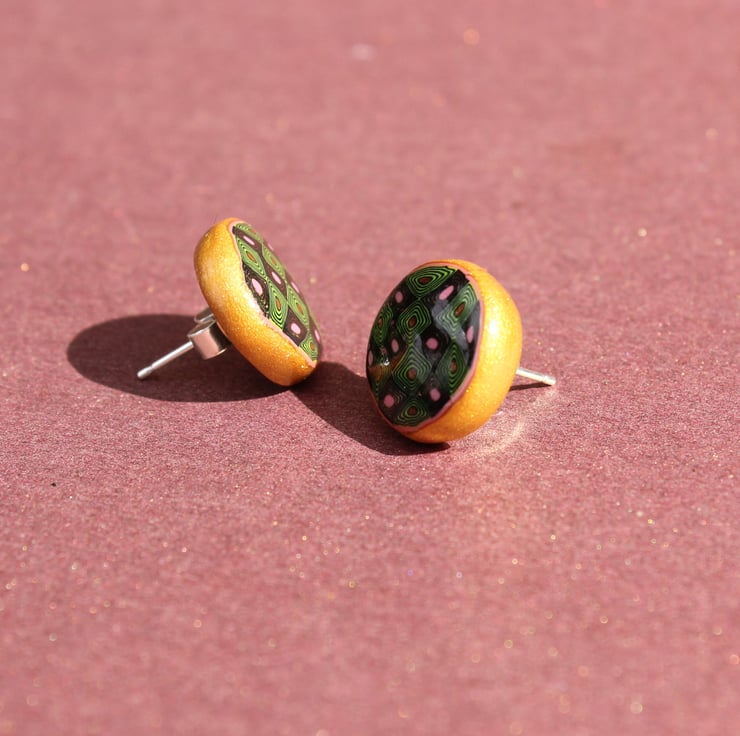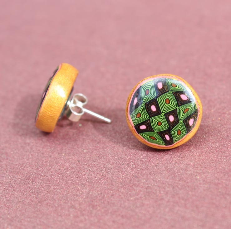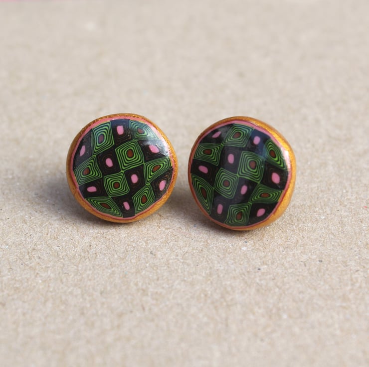 A fascinating and entrancing pattern pair of ear studs. These are entirely thought up and made by myself, from polymer clay, and are very unique and original.