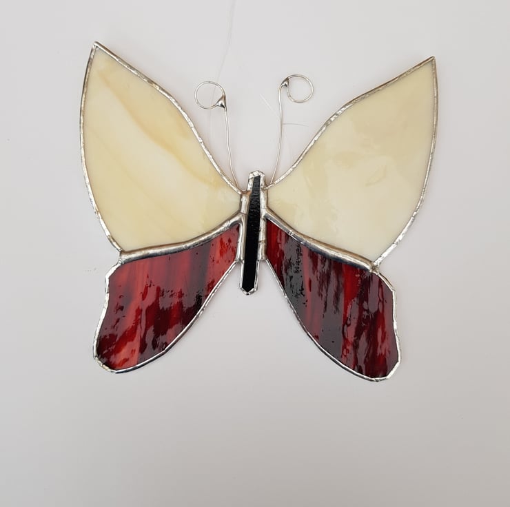 This butterfly is made using cream and red glass it has silver wire antenna and a ring with invisible thread for hanging.