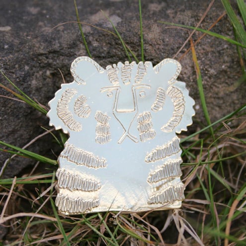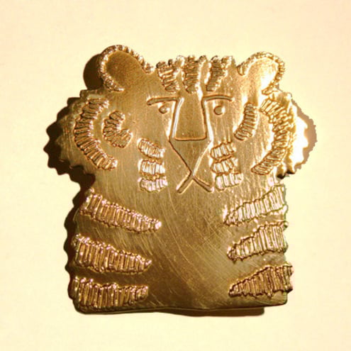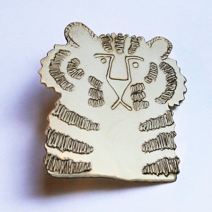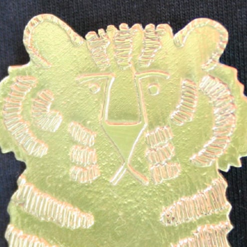 Large tiger head brooch,not the fiercest of tigers though. I thought he would look nice peeking out of a pocket,or even on a hat.