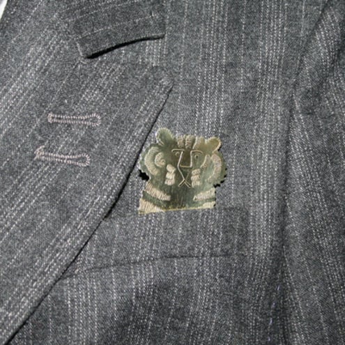 It is made from sheet brass,sawn out by hand then etched.It has been laquered and has a safety catch soldered to the back.