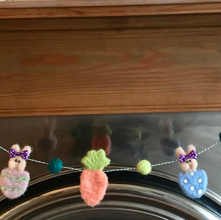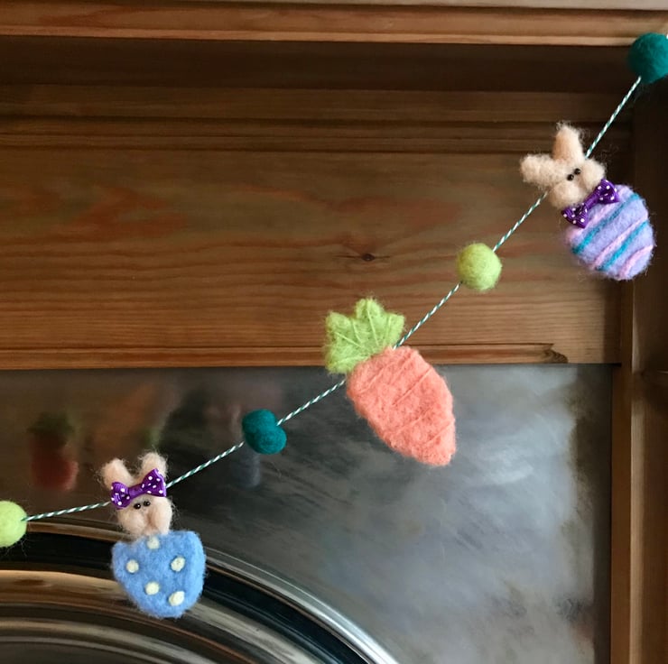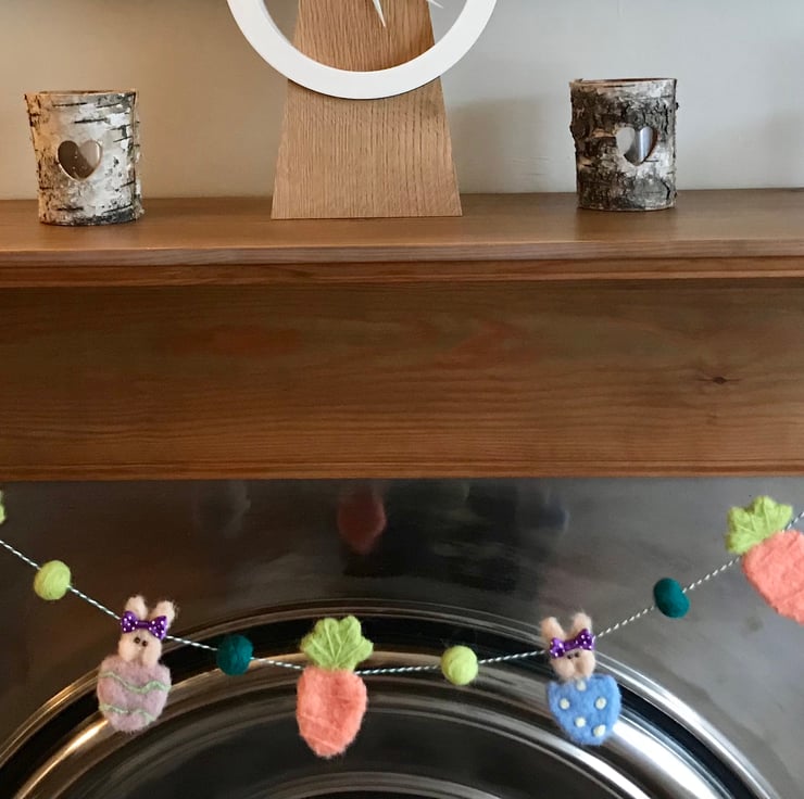 A hand felted Garland adorned with three tasty carrots and four bunnies peaking out of decorated eggs all ready to have a nibble.