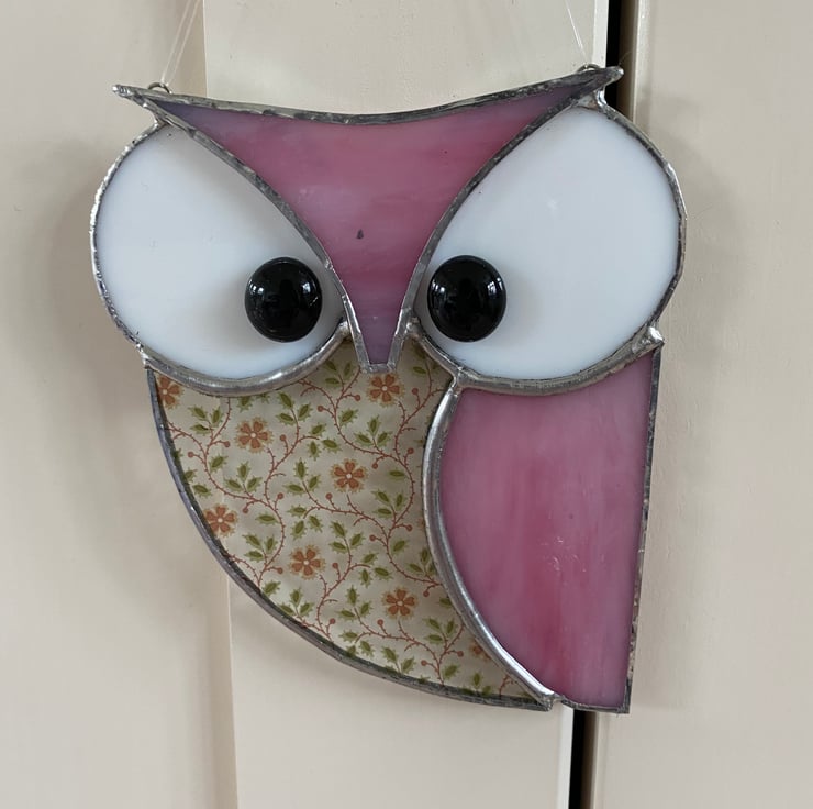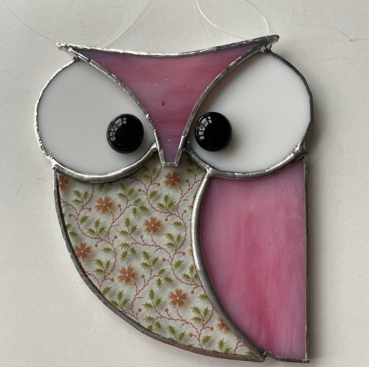 A beautiful stained glass owl made using the Tiffany ( copper foiled ) method of stained glass . It is made in a lovely pink opaque ,white opaque and clear pink and green flowery glass with 2 black glass nugget eyes.