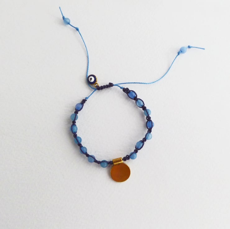 Adjustable Blue cord bracelet with a tiny evil eye enameled charm.