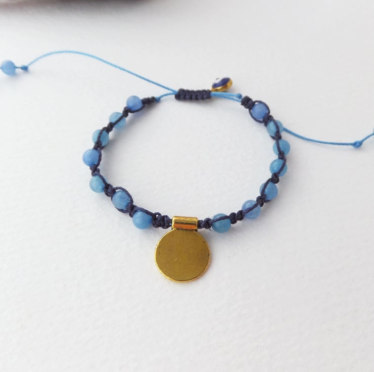 Simple and chic, a blue jade shamballa bracelet with gold alloy charm.