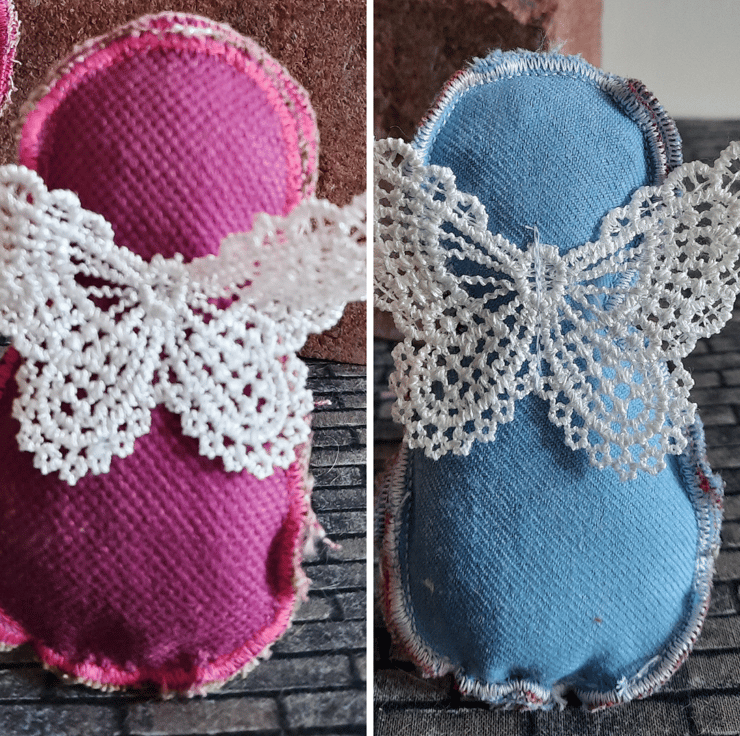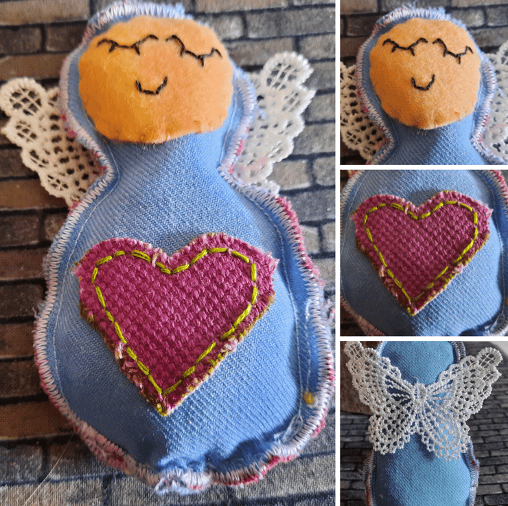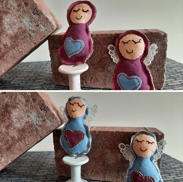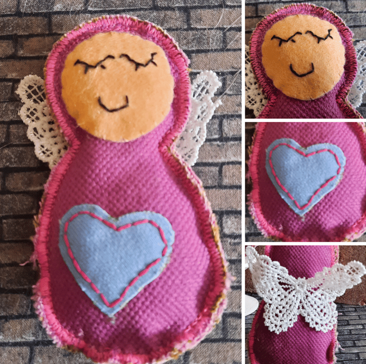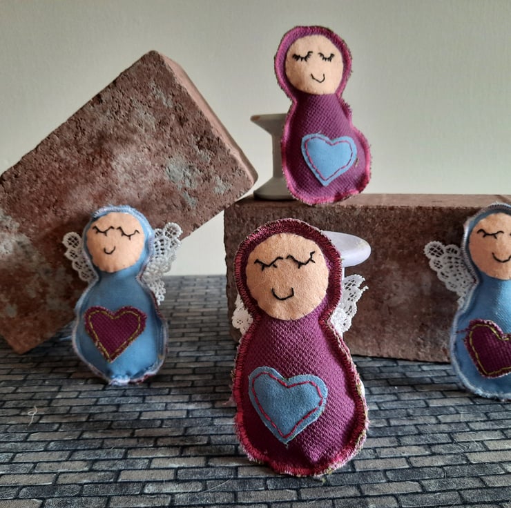 Handmade with care, each angel is upcycled from fabric samples, making them as sustainable as they are charming. The angels are embellished with a heart in a complementary colour for a touch of sweetness, and their wings are crafted from delicate lace for added texture and elegance.