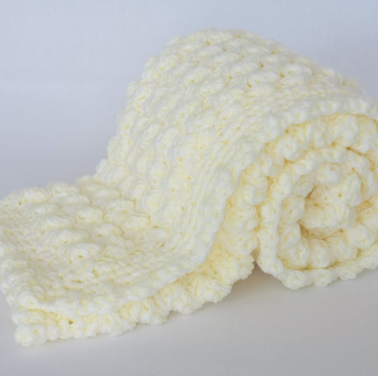 I make the blanket using two strands of double knitting yarn at one time creating a thick, soft, luxurious blanket you just want to snuggle baby up in.