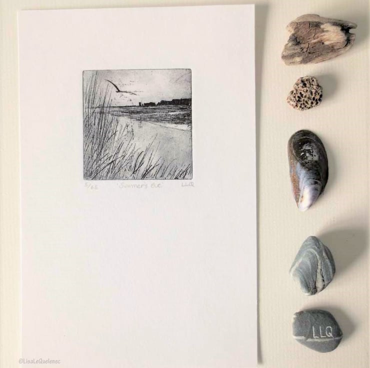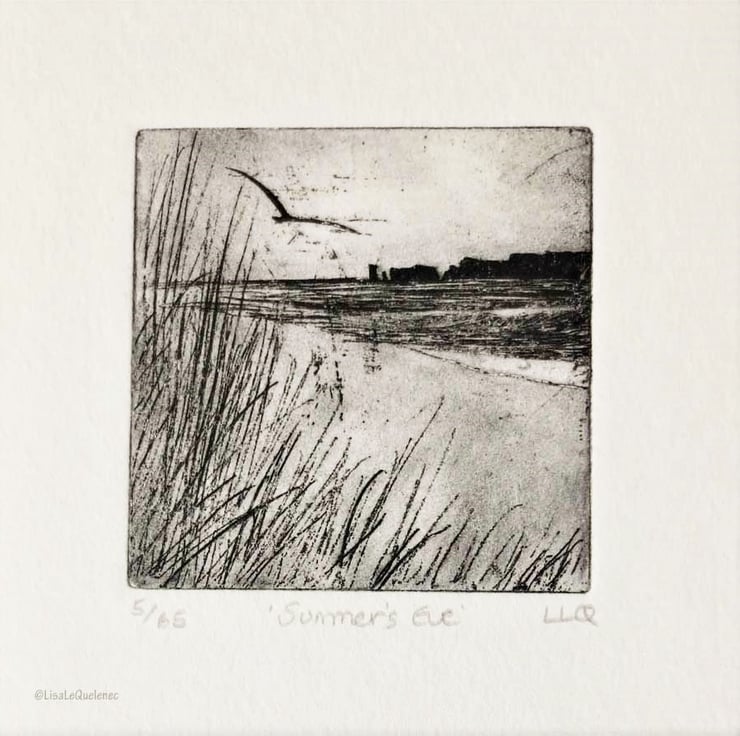 Original handmade etching print of a view of a coastal beach scene printed in black ink on white paper. This is print no.5 in an edition of 65. Image size 6x6cm ( approx 2.5x2.5inch) and it's printed on to 12.5x20cm paper (approx7.75x5inch). The artwork will be shipped in a cellophane sleeve with cardboard front and back for added protection.