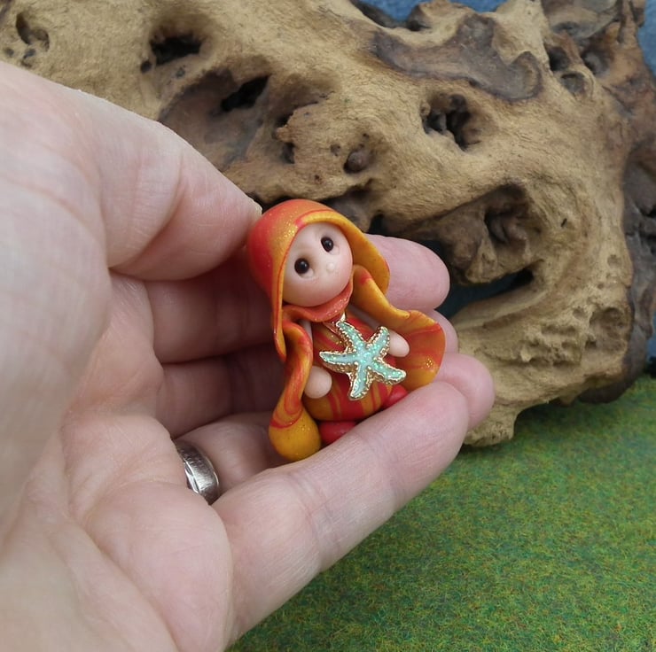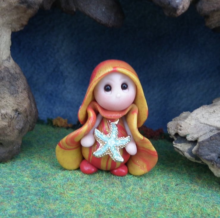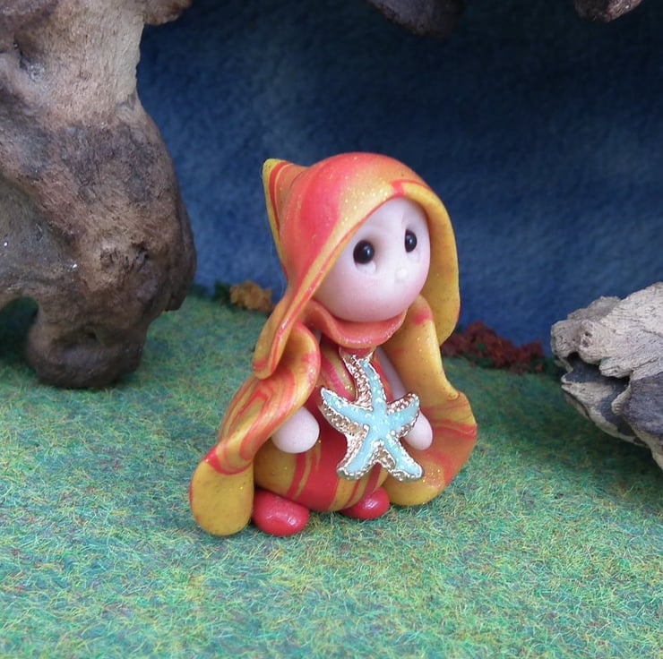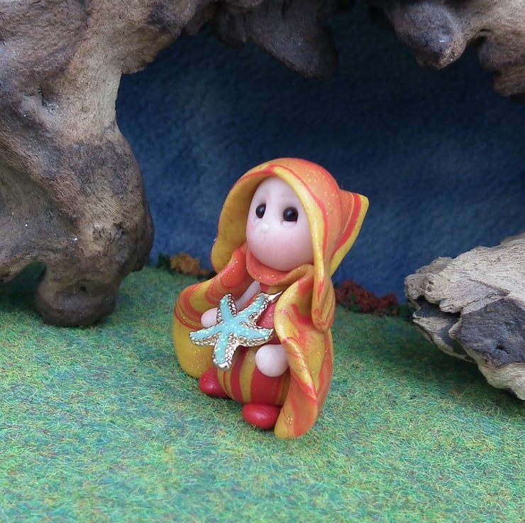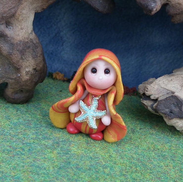 This is a 'one of a kind' creation having been entirely handmade without the use of moulds here at my studio on the Sussex Coast. Modelled with Prosculpt polymers, painted with heat set paints before sealing with lacquer, Starla has sparkling black onyx eyes and variegated robes. Starla the Gnome Maiden is just one and a half inches tall.