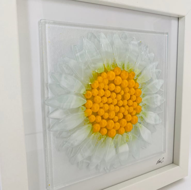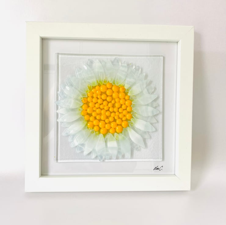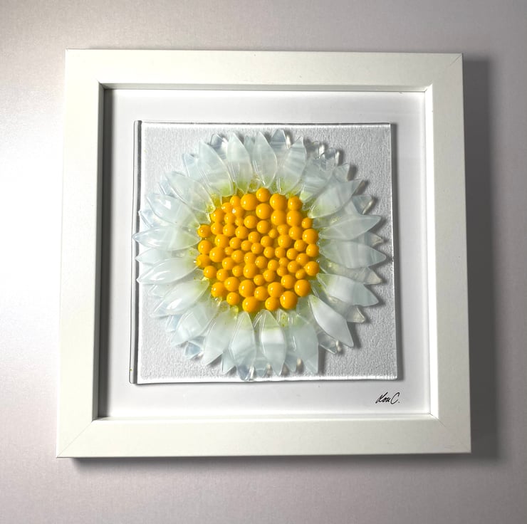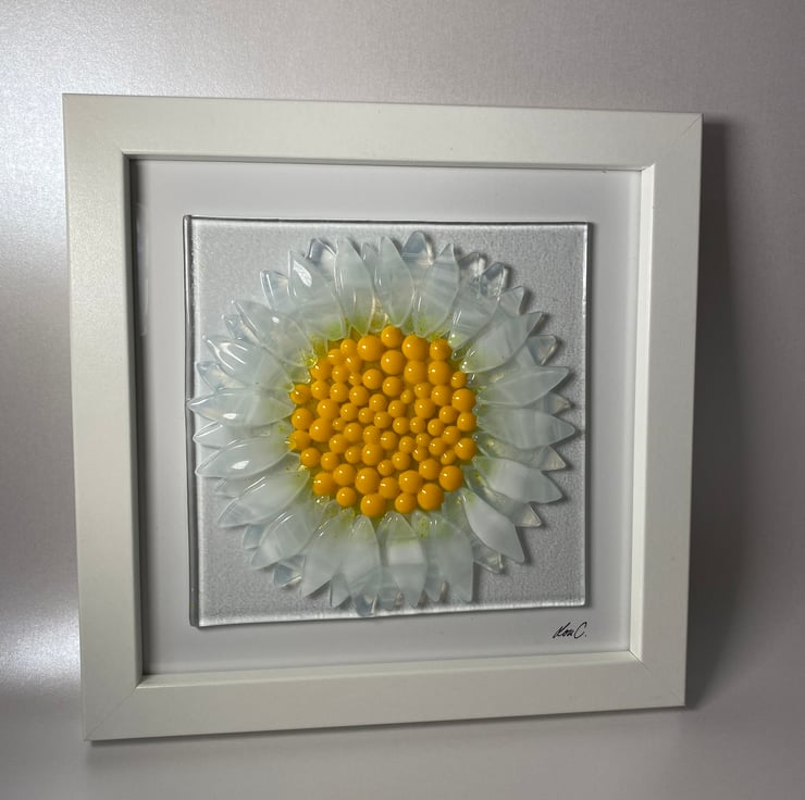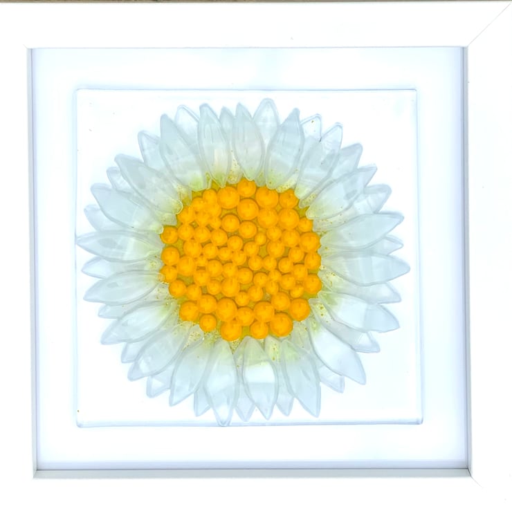 The hlass daisy is mounted on a 23cm square white wood frame and is ready to hang .
