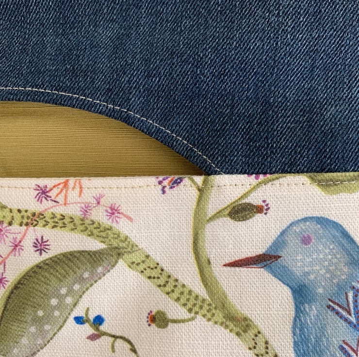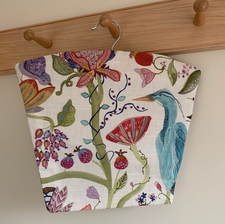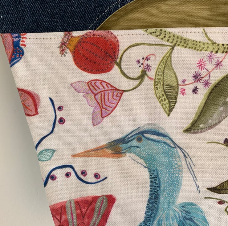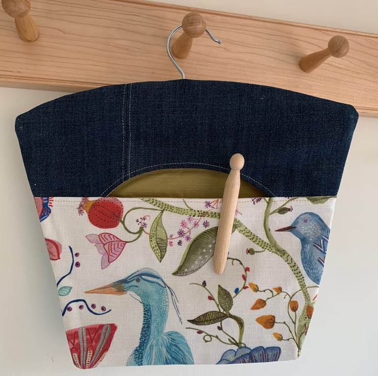 Pretty peg bag made from voyage cotton with birds and flowers and reclaimed denim. The peg bag is fully lined with cotton.