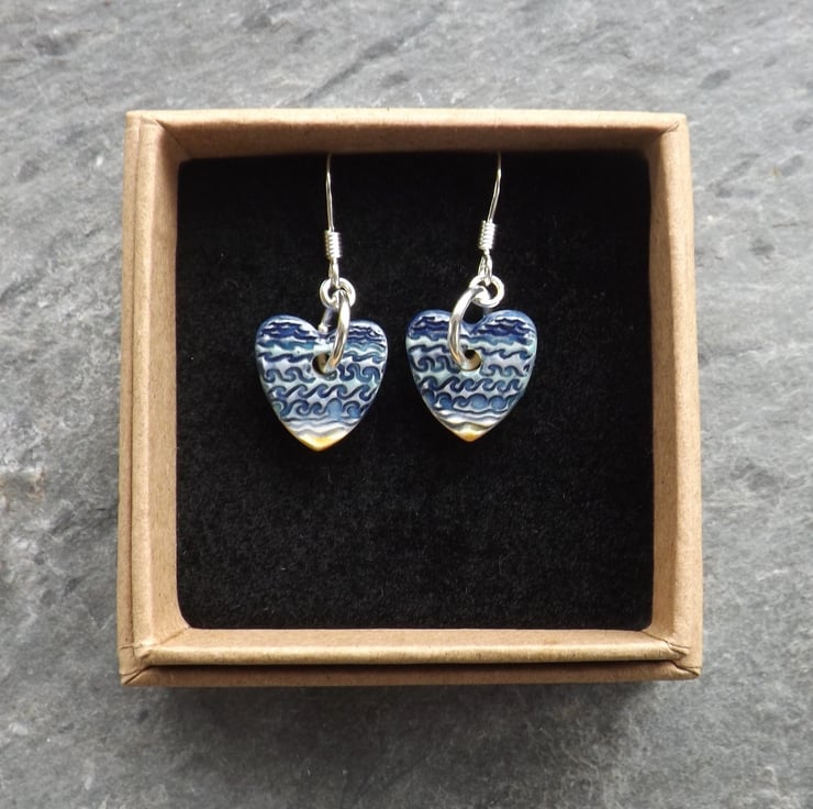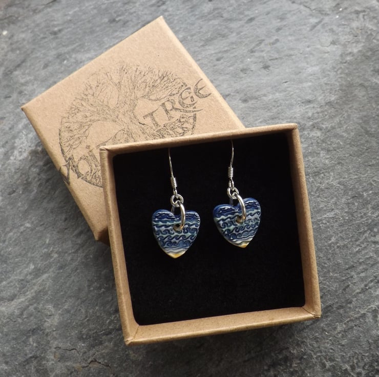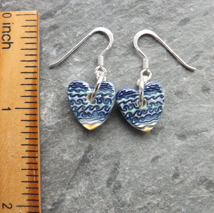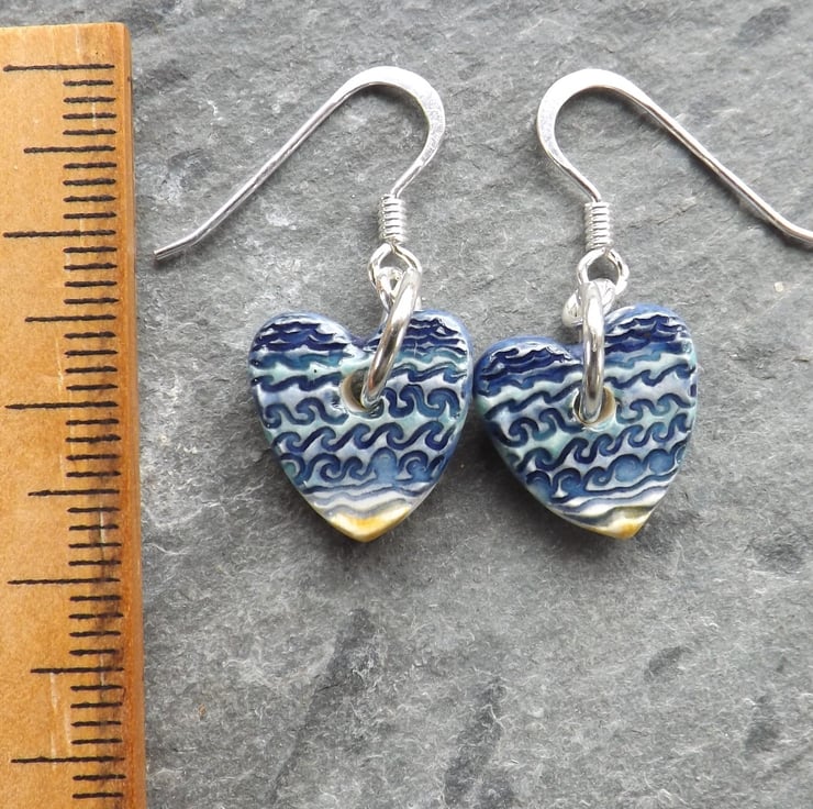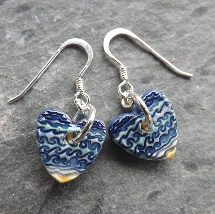 Handmade ceramic and sterling silver heart shaped Waves drop earrings