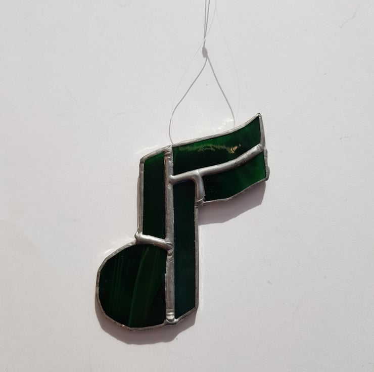 This single note is made in green glass and has one rings and invisible thread for hanging.