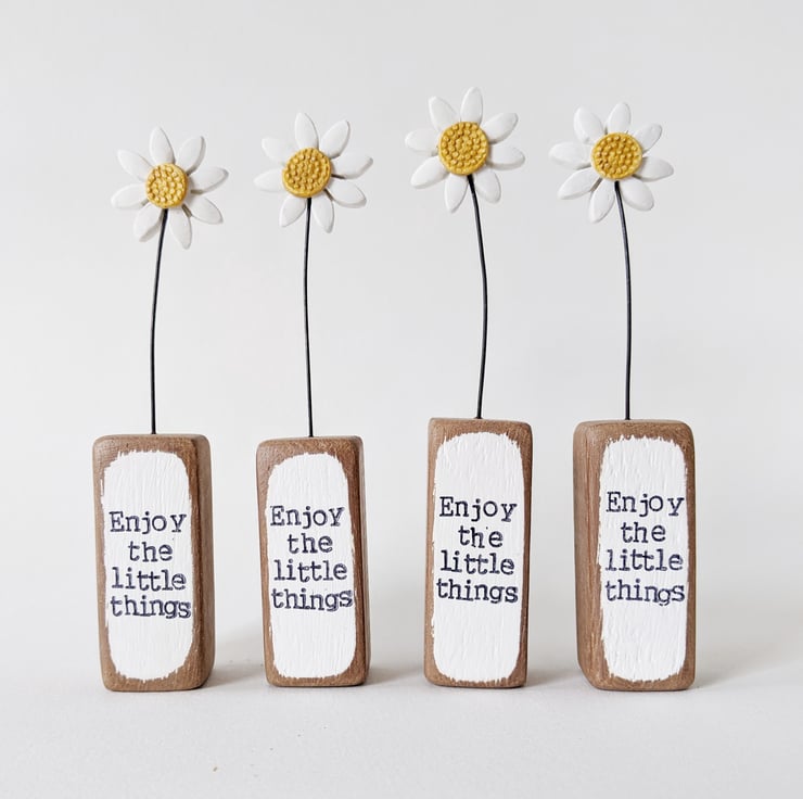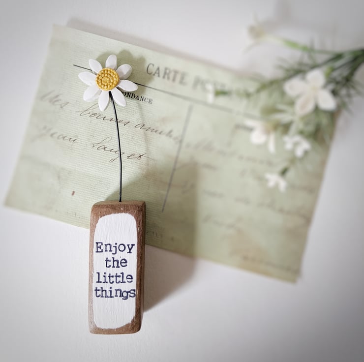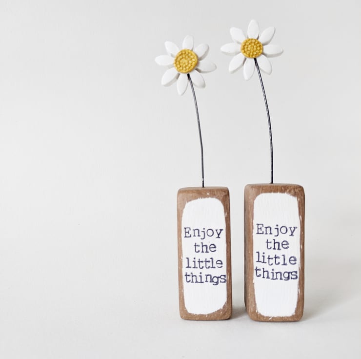 The front of the wooden block is hand stamped with the words 'Enjoy the little things'.