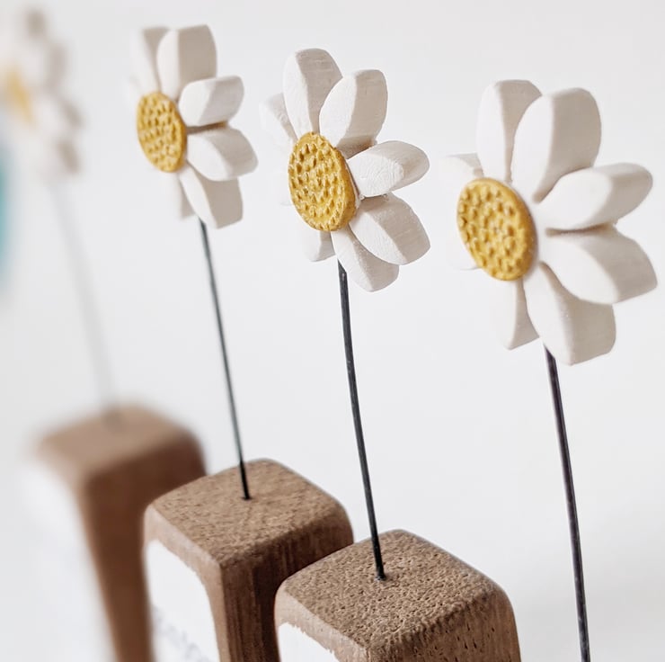 A little clay daisy stands on a wire stalk in a sanded and stamped wooden block.